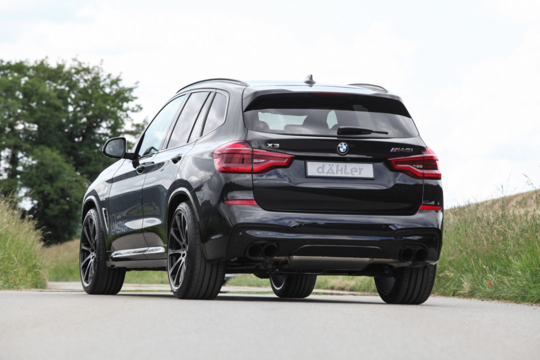 Zmiany, choć z pozoru niewielkie, wystarczyły by kruczoczarne BMW X3 ze standardowym w wersji M40i pakietem M, obejmującym m.in. pakiet aerodynamiczny czy powiększone hamulce z czterotłoczkowymi zaciskami z przodu, nabrało charakteru. Zmiany przeprowadzone przez Dähler Design & Technik GmbH – w szczególności zakończony czterema rurami układ wydechowy, którego nie posiada seryjne X3 M40i – upodobniły auto do pełnowartościowej eMki. Także parametry silnika 3.0 R6 nie pozostawiają wiele do życzenia. W końcu SUV osiągnął poziom M3/M4, którego motor rozwija 431 KM i 550 Nm.