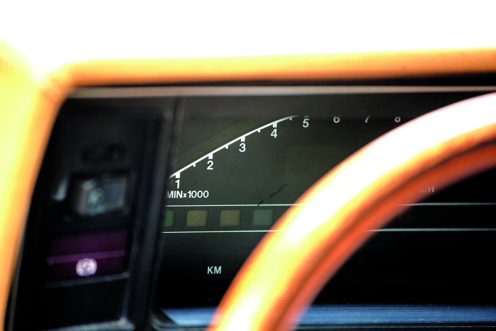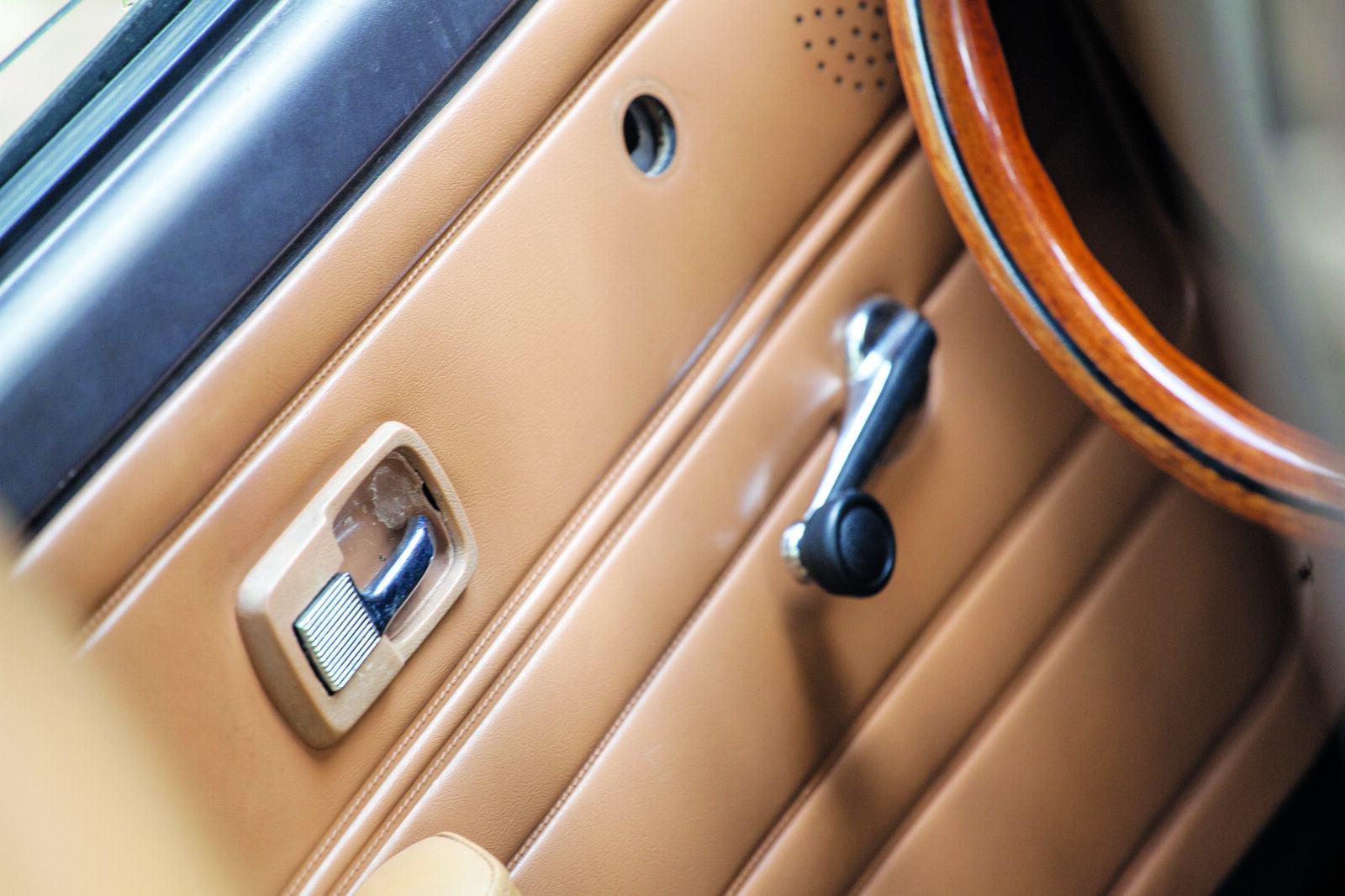W tunelu środkowym umieszczono wskaźniki od zawieszenia pneumatycznego. Totalny miszmasz, a mimo to wszystko wygląda, jakby od tak miało być. Brązowy dywan, beżowomusztardowe fotele, boczki i deska, bambusowe drewno za plecami, a do tego szare nadwozie z chromami ‒ bardzo przemyślane i trafione zestawienie kolorów.