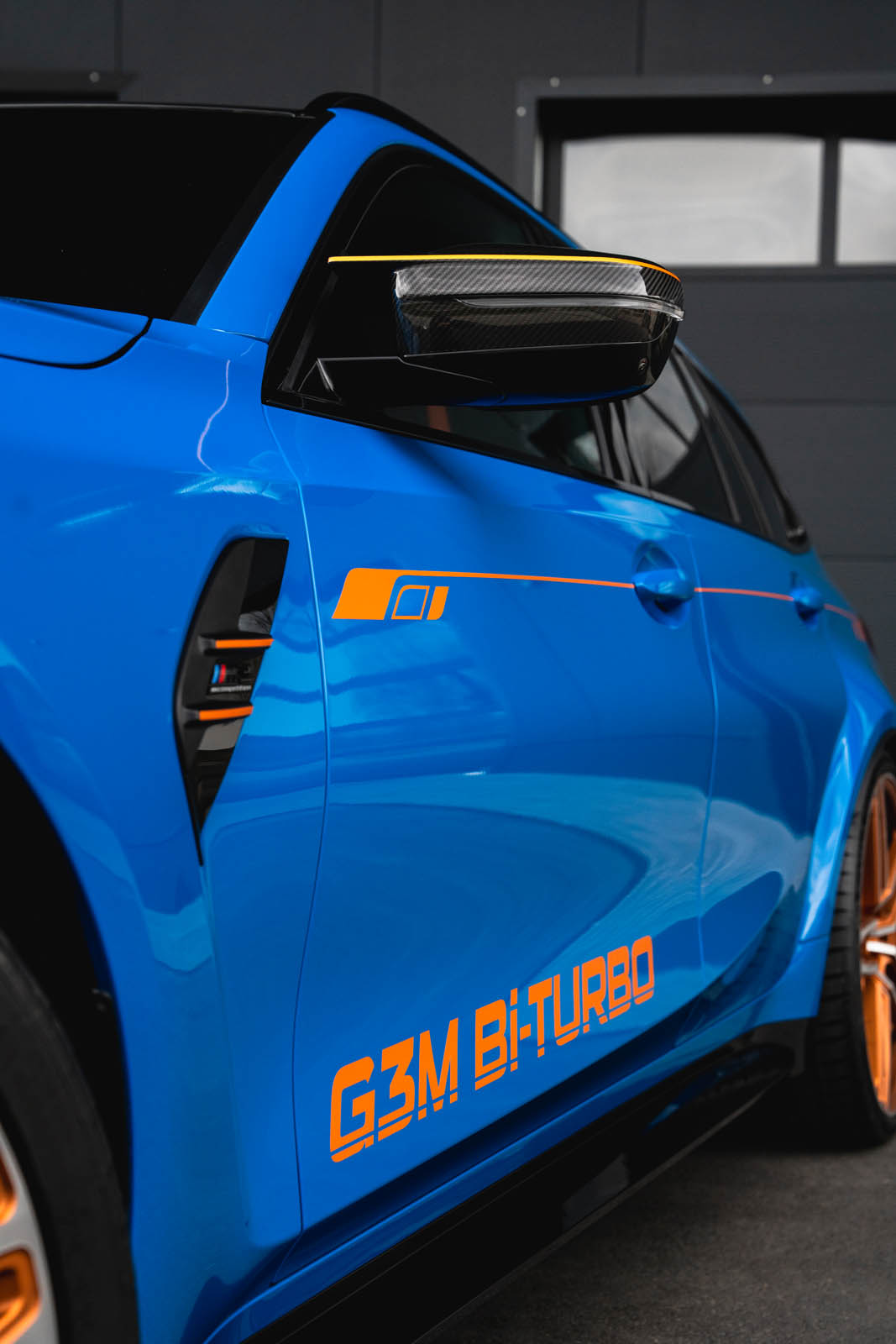 Chociaż widoczny tu na zdjęciach model G3M Bi-TURBO 800 Touring tutaj może mieć lakier o groźnie brzmiącej nazwie Voodoo Blue, czarna magia nie ma nic wspólnego z potężnym wzrostem wydajności tego mocnego kombi wyposażonego w 3,0-litrowy rzędowy silnik S58 z podwójnym turbodoładowaniem.