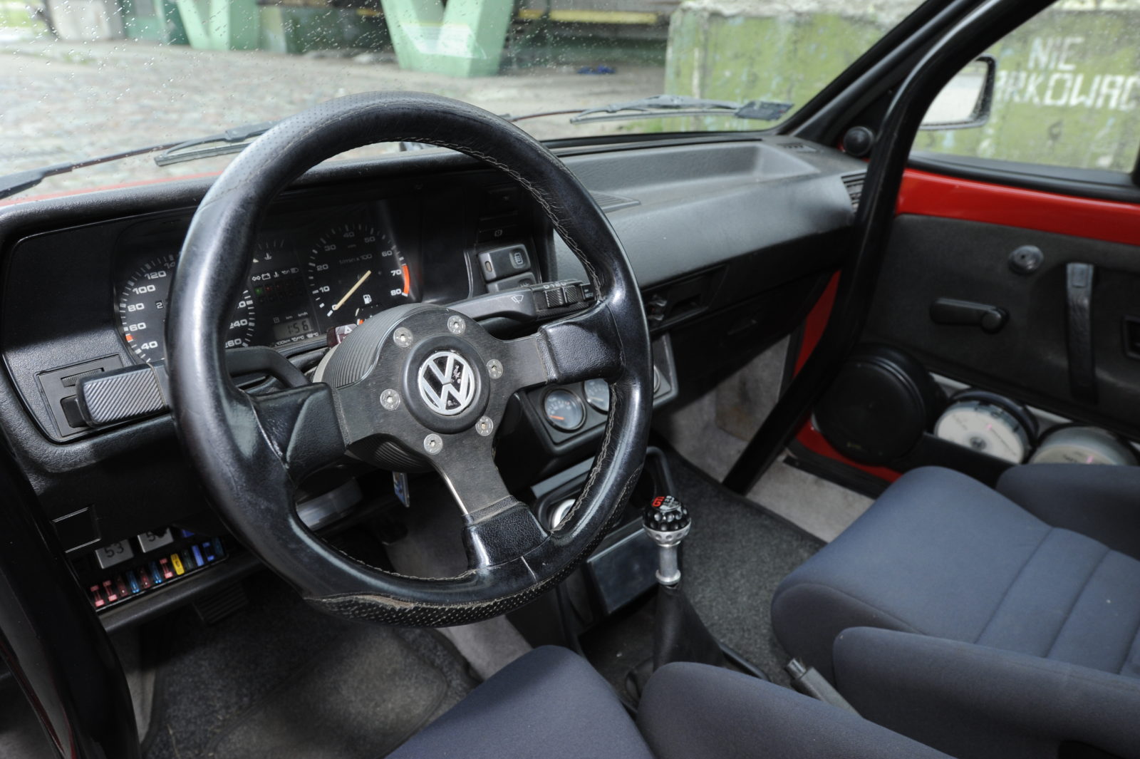 Koła to zupełnie inna historia. Było ich trochę – przed zamontowanymi obecnie 15-calowymi BBS RM poszerzane 13-calowe stalówki, 14-calowe aluminiowe Ronale czy oryginalne BBS z Golfa trzeciej generacji. Tyle na zewnątrz, co w kabinie?