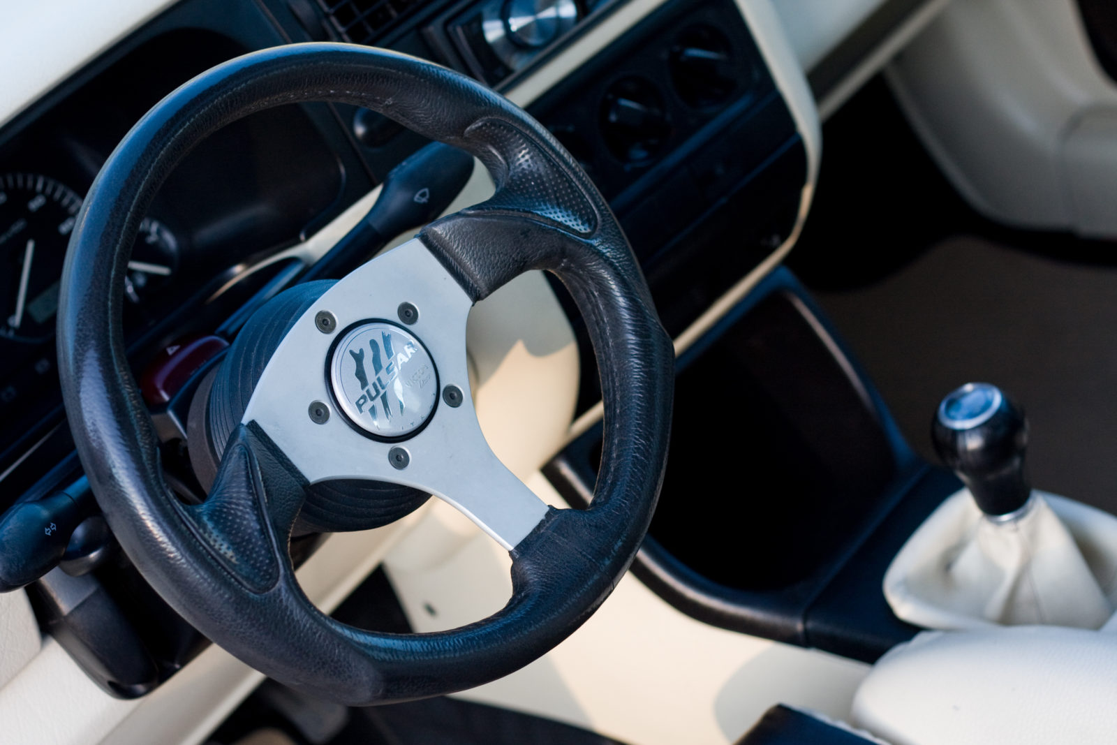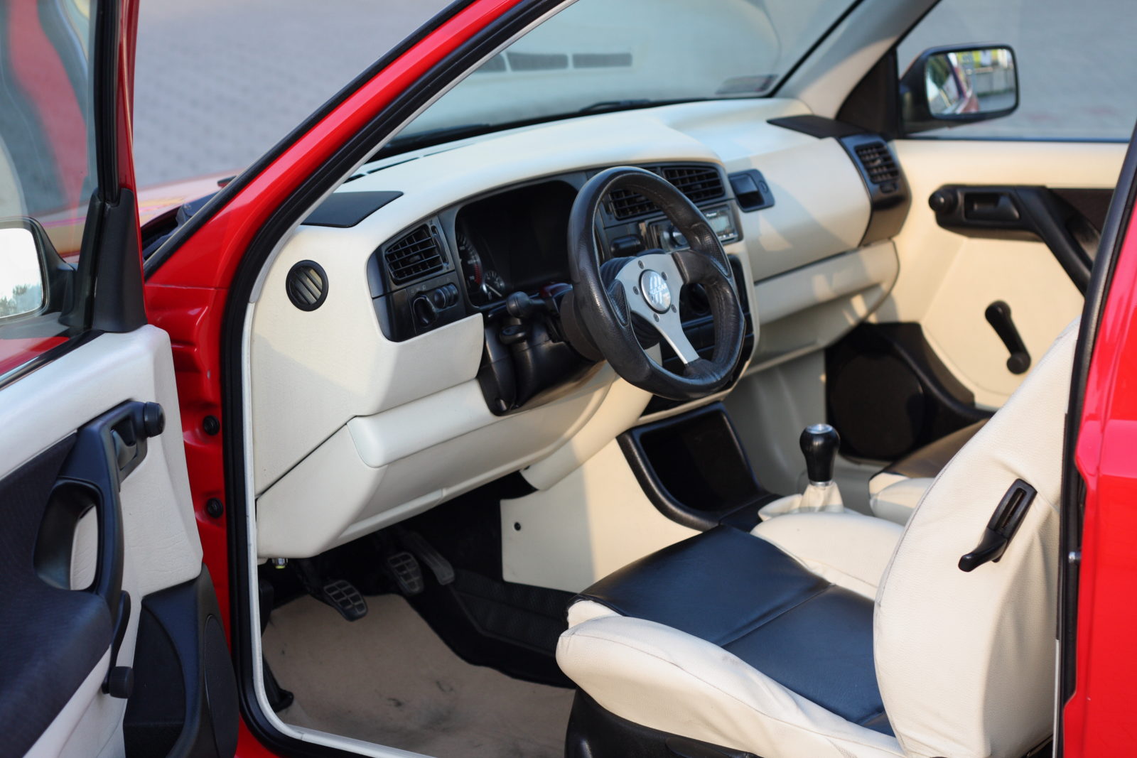 WNĘTRZE: siedzenia z VR6, pomalowana deska i boczki, szachownica na tylnej półce, obudowany bagażnik, kierownica sportowa 28 cm, biało-niebieskie podświetlenie zegarów