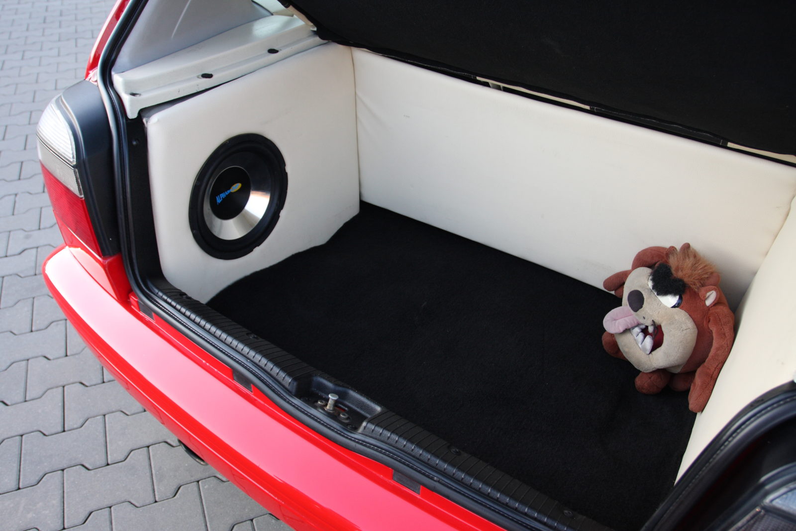 AUDIO: radioodtwarzacz Pioneer, wzmacniacz Kenwood, skrzynia basowa Alphard zabudowana w bagażniku, z przodu cztery głośniki Pioneer