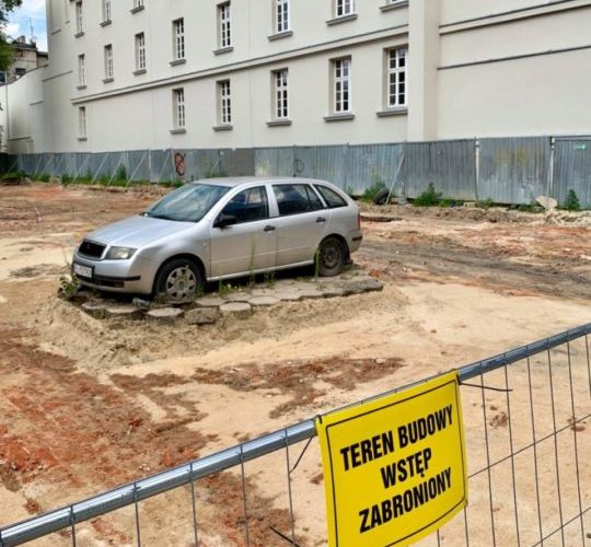 Centrum Łodzi wzbogaci się o nowy dukt. Pasaż Majewskiego zastąpi dziki parking przy ul. Jaracza, ale jest pewien problem- na środku placu budowy stoi zaparkowana Škoda Fabia.