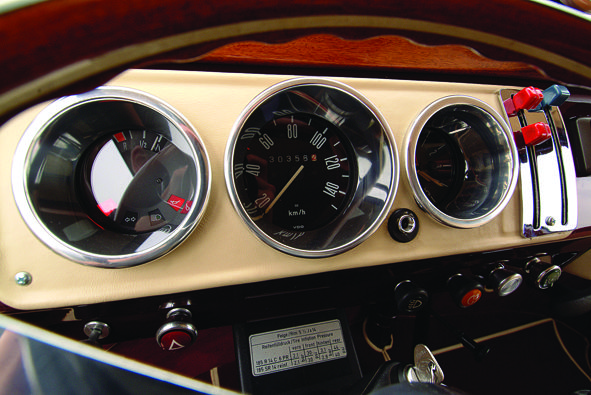 Pozostałe elementy tapicerki również są nowe. Tak jak i Bus, Doka ma wszystkie nowe dywany, pięknie odrestaurowaną deskę rozdzielczą i ten sam obrotomierz. Taka sama jest również drewniane koło kierownicy Nardi Torino z trzema aluminiowymi ramionami oraz chromowana dźwignia zmiany biegów SCAT. Uwagę zwracają zegary VDO z USA.