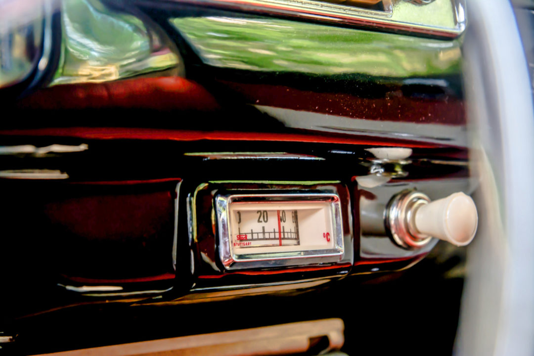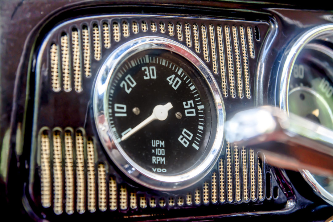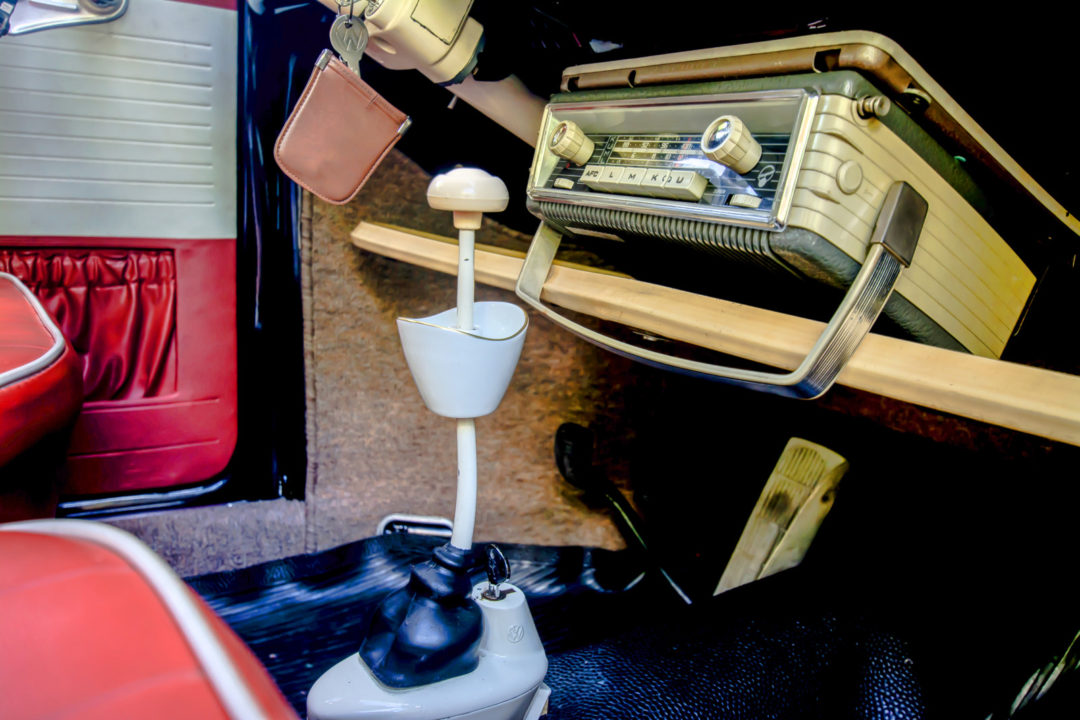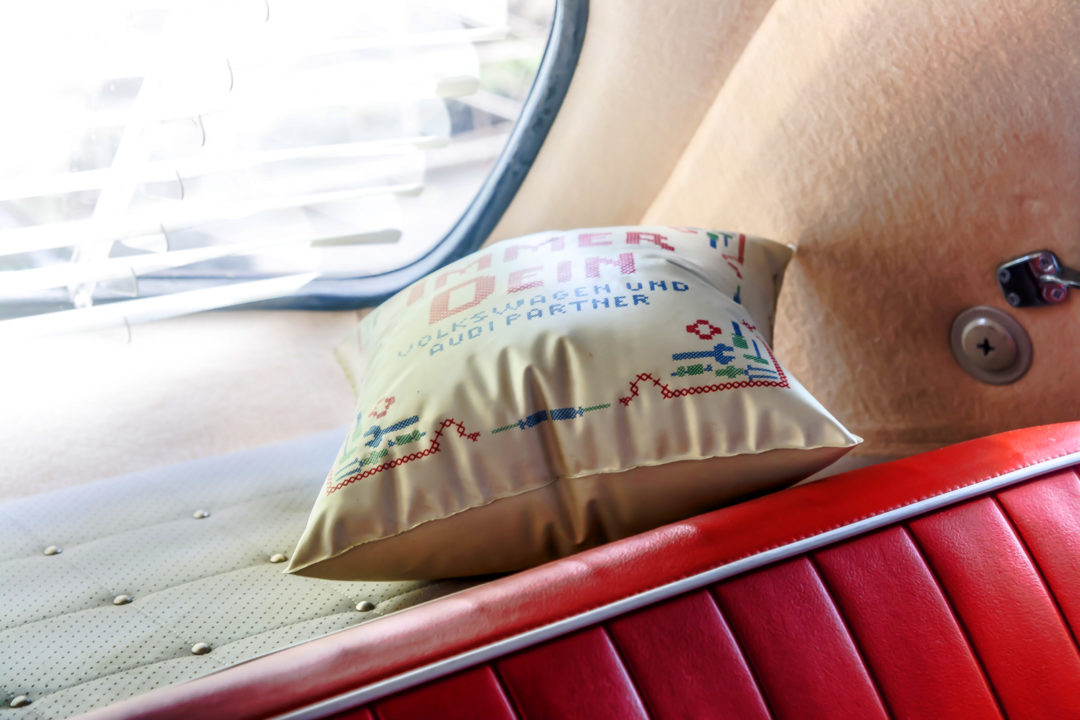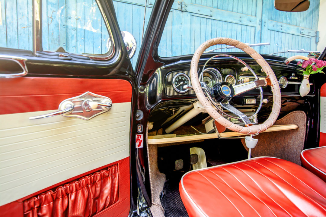 | oryginalne boczki drzwiowe w kolorze ceglastym, tapicerka zamówiona w USA na wzór oryginalnej, kierownica Empi, obrotomierz VDO, wskaźnik poziomu paliwa Draeger, wskaźnik temperatury Stork, zegarek Kienzle „8 tage”, półka na dodatkowe rzeczy, nakładka na dźwignię migacza, dodatkowe rączki do otwierania drzwi, nakładki VW pod lewarki otwierania okien, dodatkowy uchwyt otwierania schowka na desce rozdzielczej, wskaźnik limitu dziennych kilometrów, dodatkowa owijka kierownicy Kamei, wazonik na kwiatki Rosenthal, popielniczka na dźwigni zmiany biegów Rosenthal, nakładka hamulca ręcznego, blokada skrzyni biegów VW, gumowa nakładka pedała gazu Kamei, wenecka roleta tylnej szyby, zasłona części bagażowej za tylnym siedzeniem Kamei, gumowa pompowana poduszka dodawana przez dilerów VW w latach 50., siatka na drobiazgi montowana w tylnej części podsufitki |