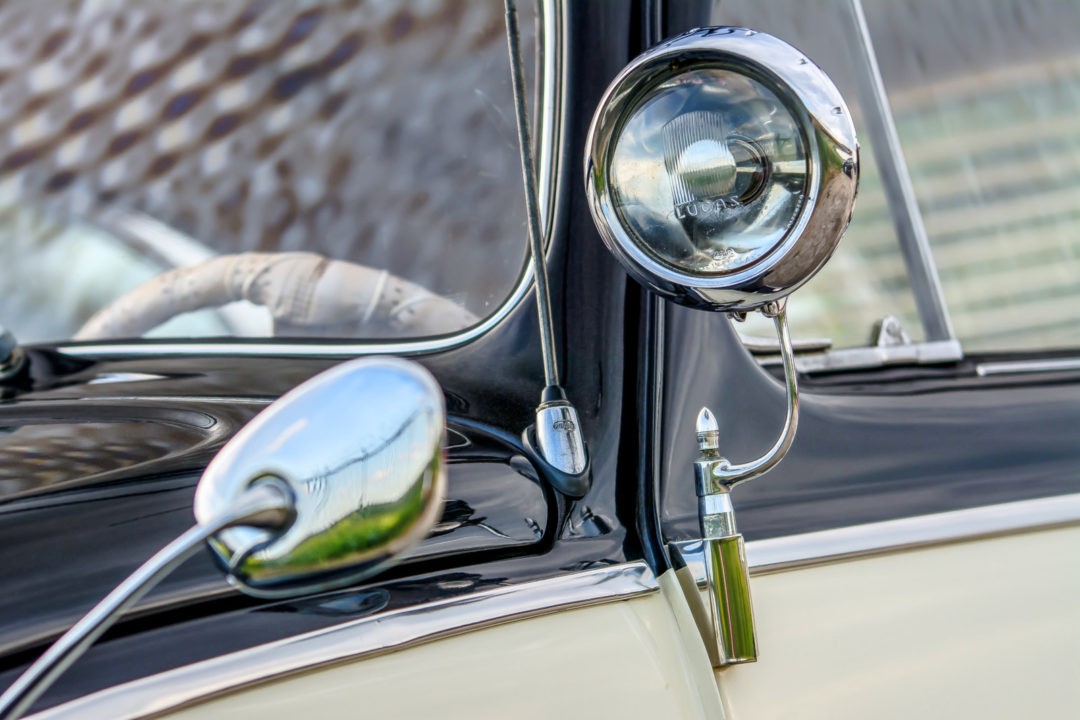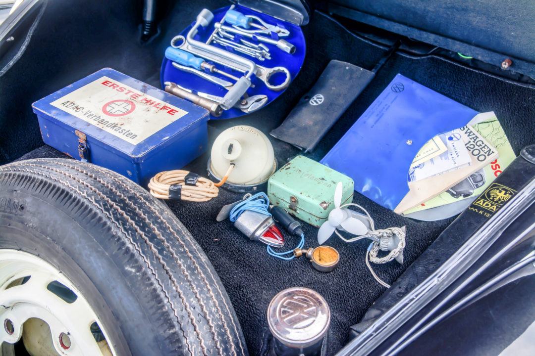 | zestaw w bagażniku pod maską: kompletny zestaw kluczy w kole zapasowym Hazet Tourist, zestaw zapasowych żarówek Bosch Autolampen, ciśnieniomierz Michelin, lampka postojowa Hella, wiatraczek Hella, trójkąt ostrzegawczy ADAC, zestaw map drogowych z lat 60., kompletna apteczka ADAC, kanister paliwa 5L Fawi, szperacz montowany do szyby przedniej Helphos |
