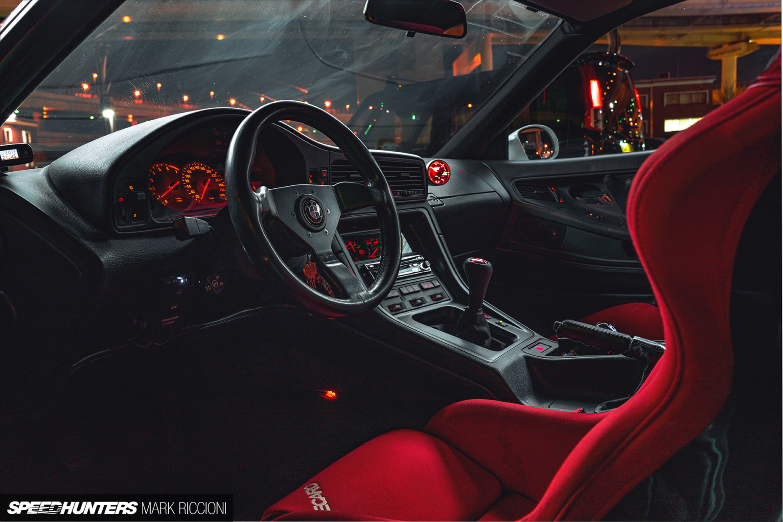 Nowy silnik ma połowę cylindrów, ale pasuje do auta rewelacyjnie. W rzeczywistości BMW nigdy nie oferowało E31 z czymkolwiek mniejszym niż V8. Przy mieszanych zamiarach używania auta na ulicy i do driftu było oczywiste, że ręczna skrzynia biegów i LSD będą niezbędne. Poprzez zamianę na silnik S38 i 6-biegową skrzynię, Ito-san zaoszczędził 100 kg w stosunku do V12. Ale redukcja masy nie kończy się tutaj. Nawiązując do koncepcji M8, Ito-san intensywnie wykorzystuje włókno węglowe. Z tyłu seria 8 nosi znaczek CSL jako bezczelny ukłon w stronę E46 M3 CSL, który był jedną z inspiracji. Może ta seria 8 ma więcej wspólnego z prostą szóstką CSL niż nawet prototyp M8? Tak czy inaczej, auto Ito-sana ma szacunkową wagę 1590 kg. To imponujące, jeśli wziąć pod uwagę, że 850i waży od 1855 do 1975 kg w zależności od silnika i specyfikacji. Wszystko to dzięki zamianie silnika i układu napędowego, ale także dzięki lekkim panelom nadwozia z carbonu: w tym zderzakom, masce silnika, jak i oczywiście dachu. Do Oryginalnego lakieru Alpineweiß II, dodano perłę, która podkreśla muskularne linie, a przedni zderzak jest ręcznie zbudowany i powstał na zamówienie. Co powiecie na usunięcie standardowych skórzanych foteli?