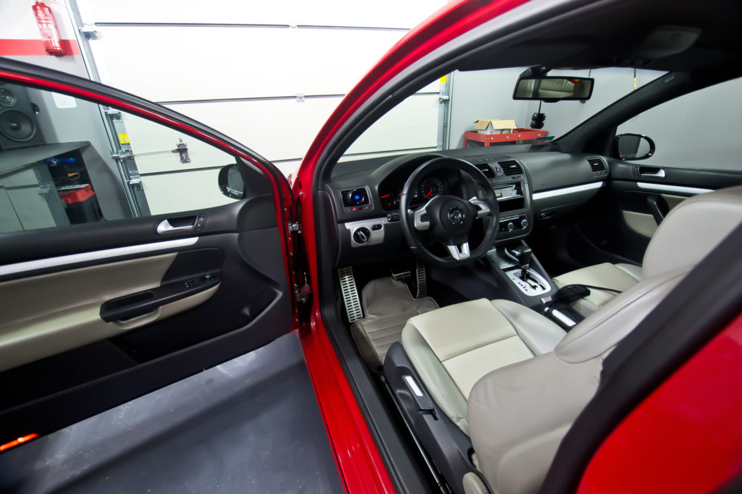 | dekory wnętrza zmienione za pomocą hydrografiki „szczotkowane aluminium”, dołożone podświetlenie klamek, kieszeni drzwi, nawiewów, nóg „przód i tył”, lampki podsufitki czarne Golf VI wersja „GTI ambiente”, lusterko fotochromatyczne, czujnik deszczu/zmierzchu, fotele/kanapa audi A3 Sportback „skóra”, tapicerki drzwi, tylna półka, podłokietnik, wnęki kieszeni drzwi, obszyte skórą, kierownica Golf VI GTD obszyta skórą, wykończona szarą nicią + łopatki sterujące skrzynią biegów, dywaniki wykonane ze skóry, podsufitka Golf VI GTI, chromowane zawiasy drzwi/maski/ oraz śruby, zegary Tiguan US, panel klimatyzacji Golf VI |