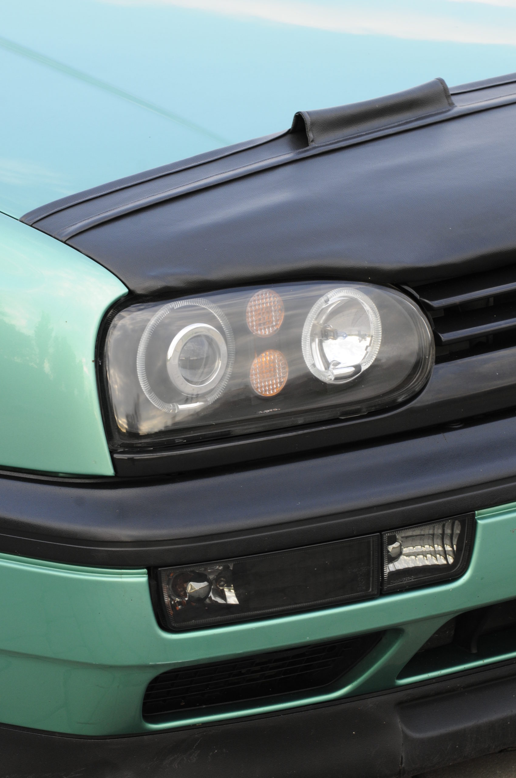 NADWOZIE: czarna bra na masce, reflektory ze światłami ksenonowymi in.pro, klosze kierunkowskazów dymione, tyle lampy Red Dark, grill Joma bez znaczka VW, pakiet GT: szeroki hokej, sierpy, listwy drzwiowe i progowe, daszek na klapie bagażnika; tylna klapa bez wycieraczki, emblematu i zamka, klamki na drzwiach pozbawione zamków.