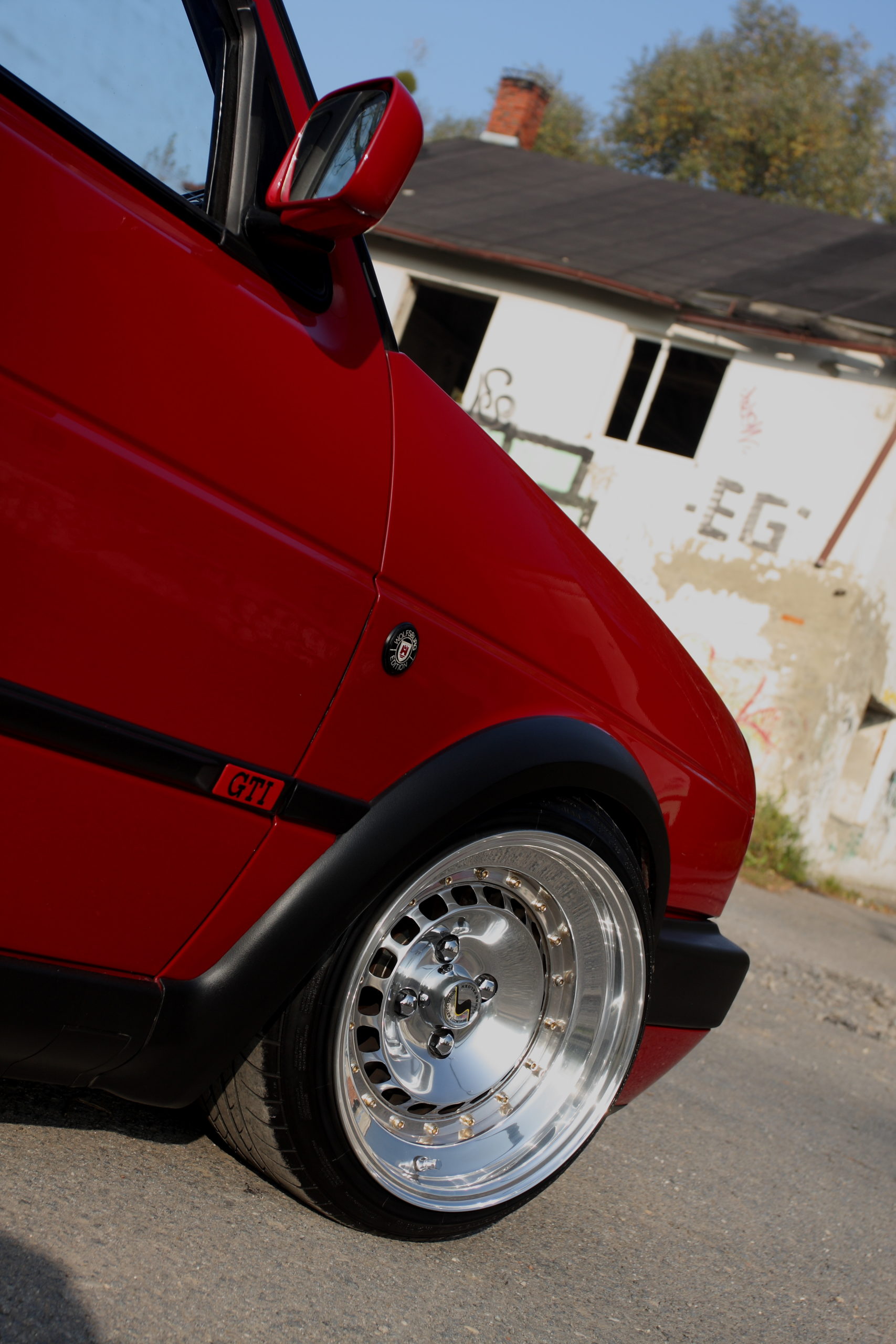 Golf postawiony jest na kołach Schmidt Revolution TH Line (polerowane) w rozmiarze 14 cali i o szerokości odpowiednio 9 cali z przodu oraz 10 cali z tyłu. Na felgi założono opony Continental 195/40 z przodu i 215/40 z tyłu.