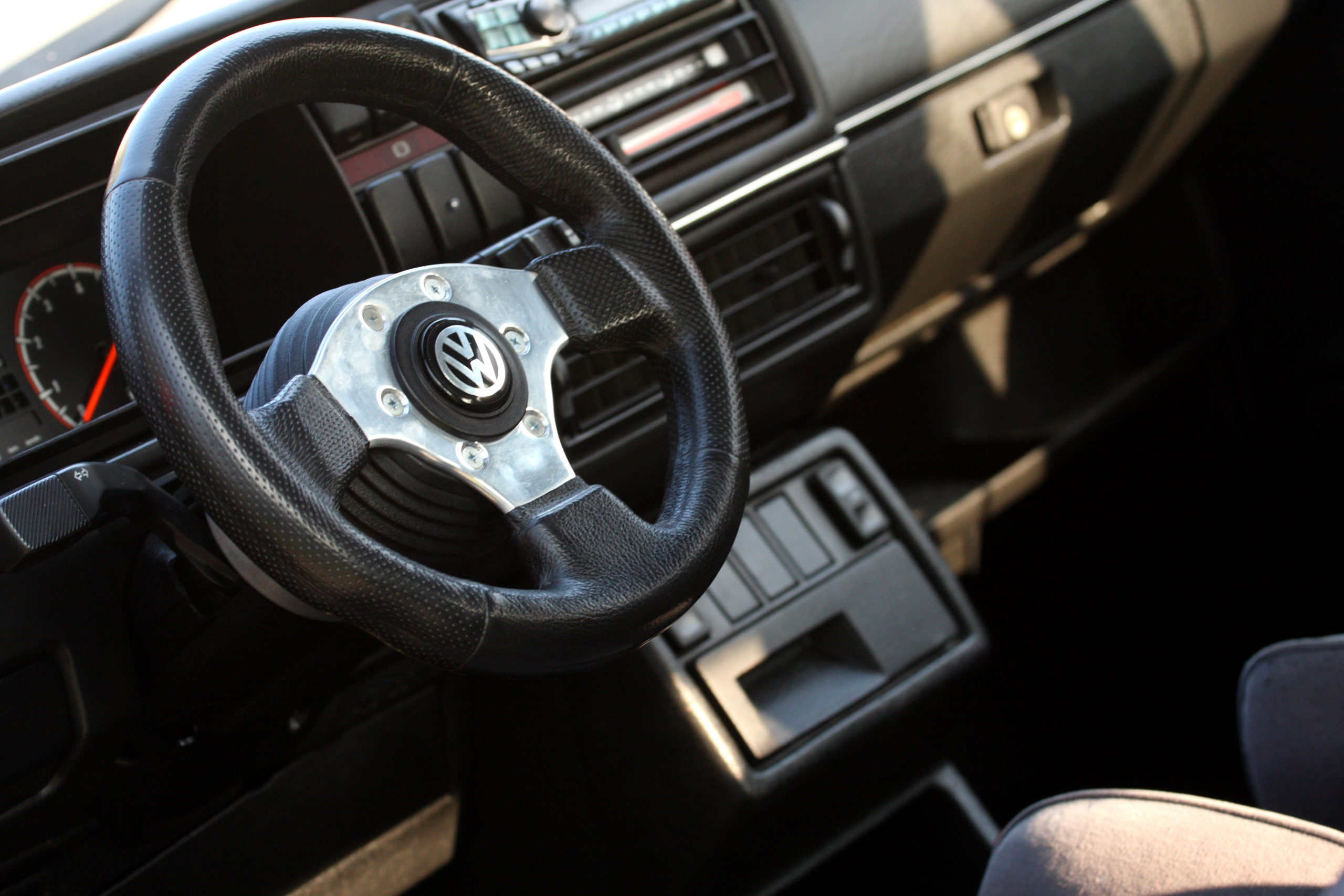 NADWOZIE: odnowiony oryginalny lakier LA3D, grill bez znaczka, dolna listwa z Jetty i brewka, przednie światła przerobione na biksenon z BMW X5 z ringami, tylne lampy Hella, dymione kierunkowskazy z postojówkami, pojedyncza wycieraczka, BRA na masce, halogeny Hella przyciemnione, oryginalny wąski hokej, nakładki na nadkola i progi GTI, wygładzona wnęka pod rejestrację w przednim zderzaku, usunięta antena z przedniego błotnika, zaspawany znaczek VW w tylnym pasie, zaspawana zaślepka na hak w tylnym zderzaku, klapa na wzór wersji US z listwą, zaklepane ranty nadkoli.