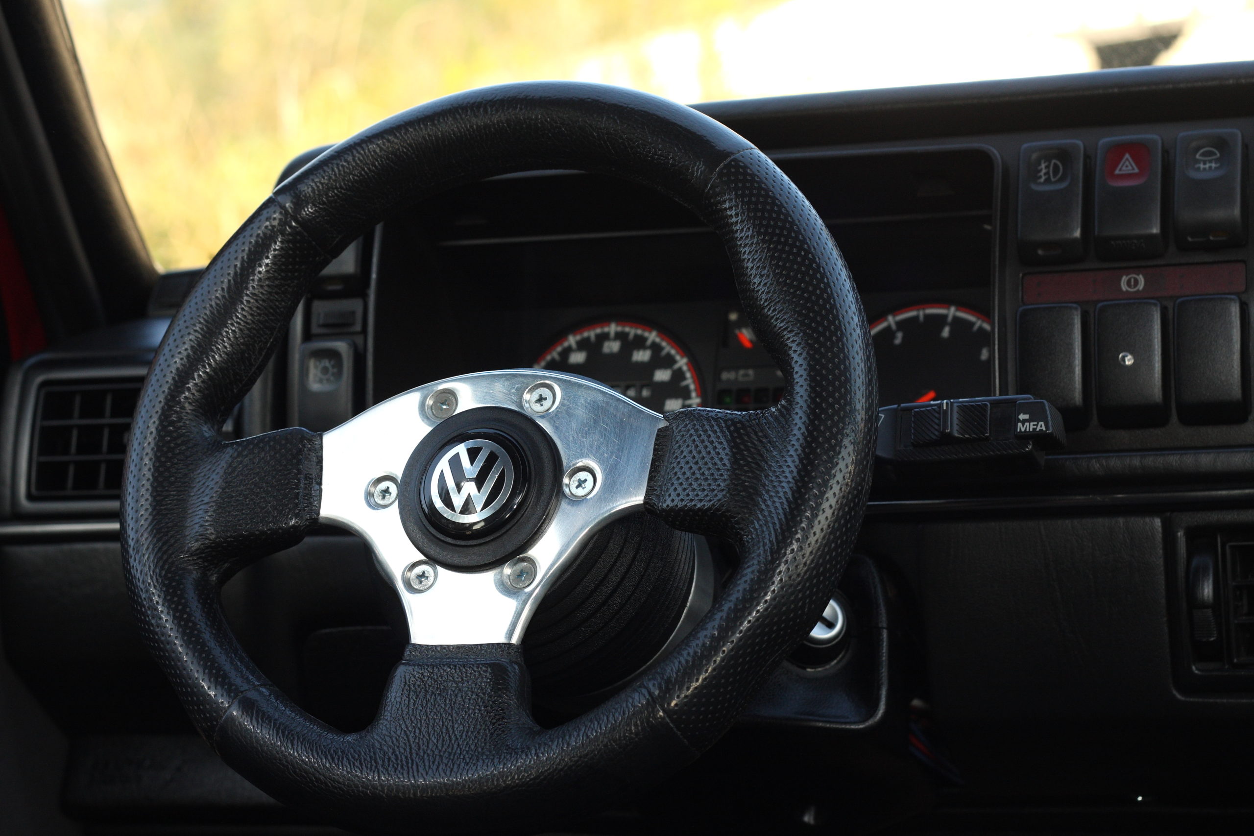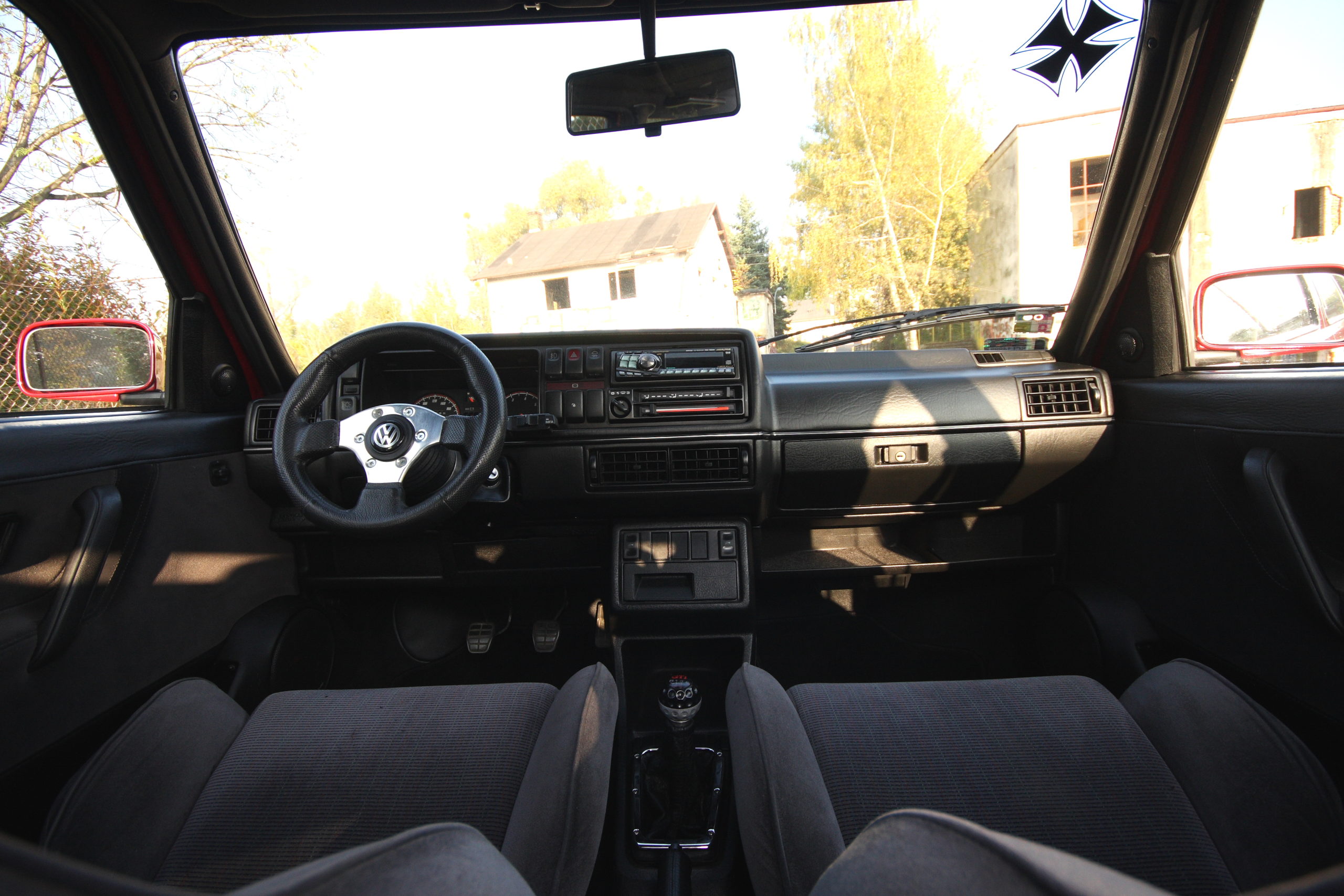 WNĘTRZE: fotele RECARO welurowe z Jetty GLI, tylna kanapa z podłokietnikiem i zagłówkami, boczki obszyte pod kolor wnętrza, kierownica Raid HP 28 cm z wypolerowanym środkiem, gałka zmiany biegów GTI z 20 Jahre, chromowana ramka zmiany biegów i klamki, przycisk w ręcznym z Golfa III, rygle, czarne słupki, podsufitka, rączki, miękka deska rozdzielcza, tarcze Indiglo oraz zmienione podświetlenie we wszystkich przełącznikach na niebiesko-czerwone, panel nawiewu Indiglo, MFA, wspomaganie kierownicy, elektryczne szyby, system domykania szyb, elektryczne lusterka, szyberdach, klapa tylna otwierana pilotem, alarm i centralny zamek, elektryczna regulacja foteli.