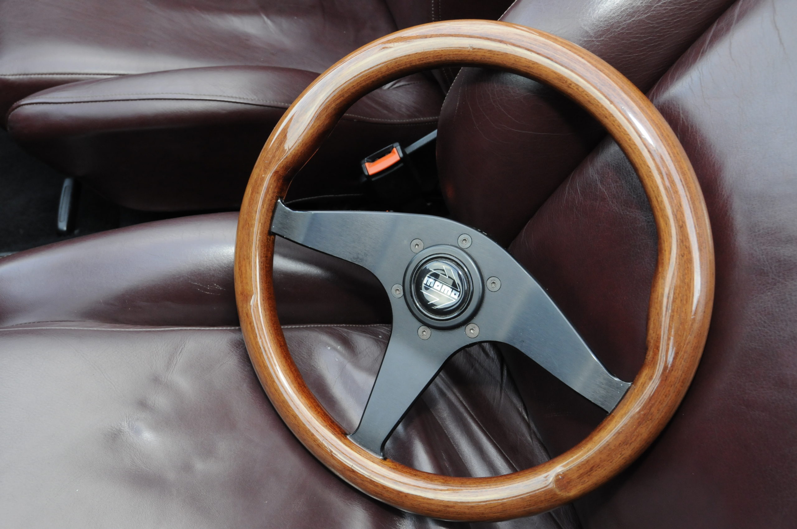 WNĘTRZE: fotele, kanapa, boczki drzwi, podsufitka i mieszek obszyte naturalną wiśniowobrązową skórą, drewniana kierownica Momo o średnicy 32 cm, naba Momo, system Snap-Off Raid.