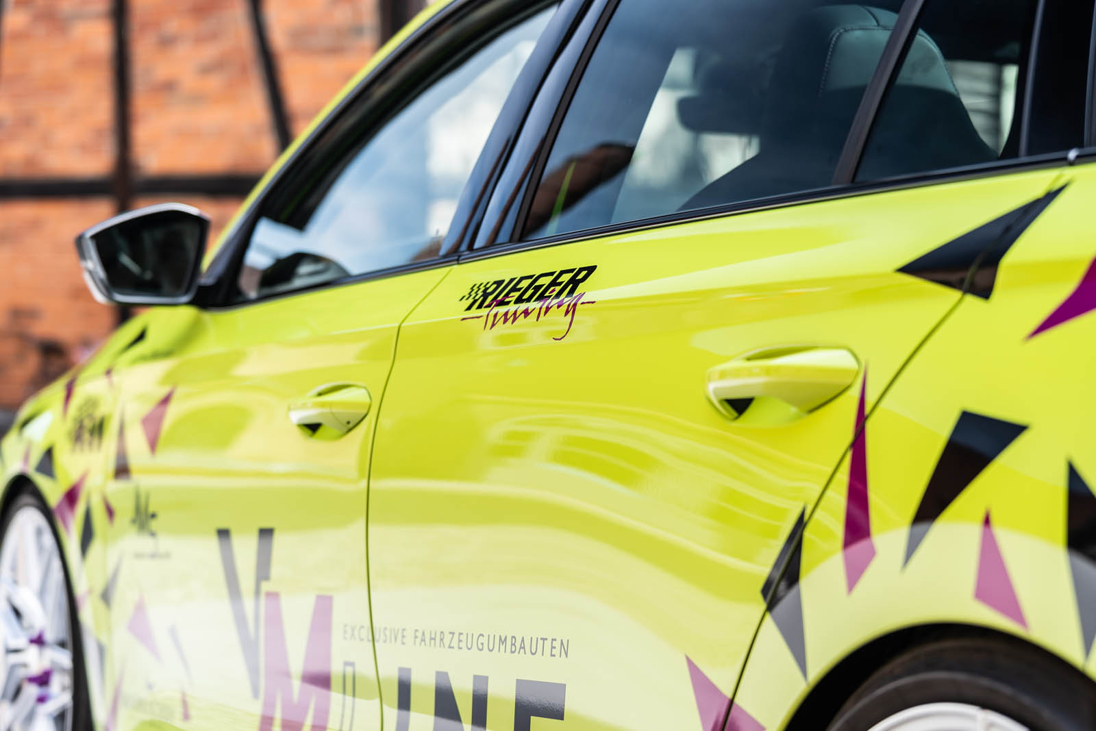 Kolejnym wizualnym hitem jest kompletny zestaw modyfikacji nadwozia od Rieger Tuning. Czarne elementy dodatkowe są jeszcze podkreślone fioletowymi paskami ozdobnymi. Na koniec, VM-Line zoptymalizował też silnik – dzięki ulepszeniu mocy APR.