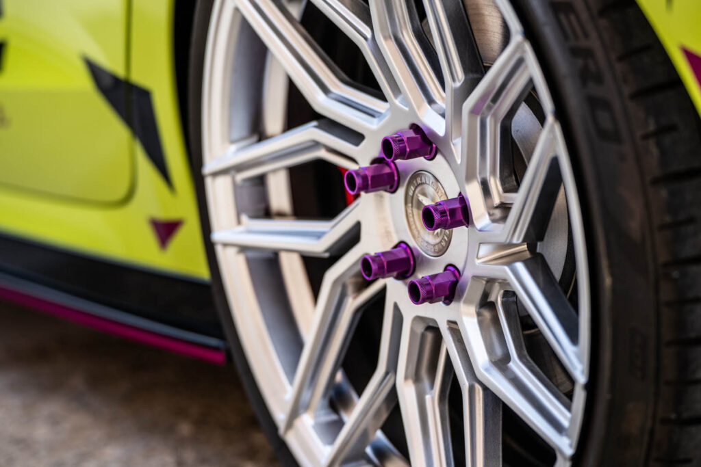 Dzięki klasycznemu, srebrnemu wykończeniu Hyper Silver, asymetryczne felgi niezawodnie przyciągają wzrok – choć nie jest to łatwe zadanie, biorąc pod uwagę kłujący w oczy neonowożółty kolor nadwozia VM-Line z fioletowymi i czarnymi akcentami.