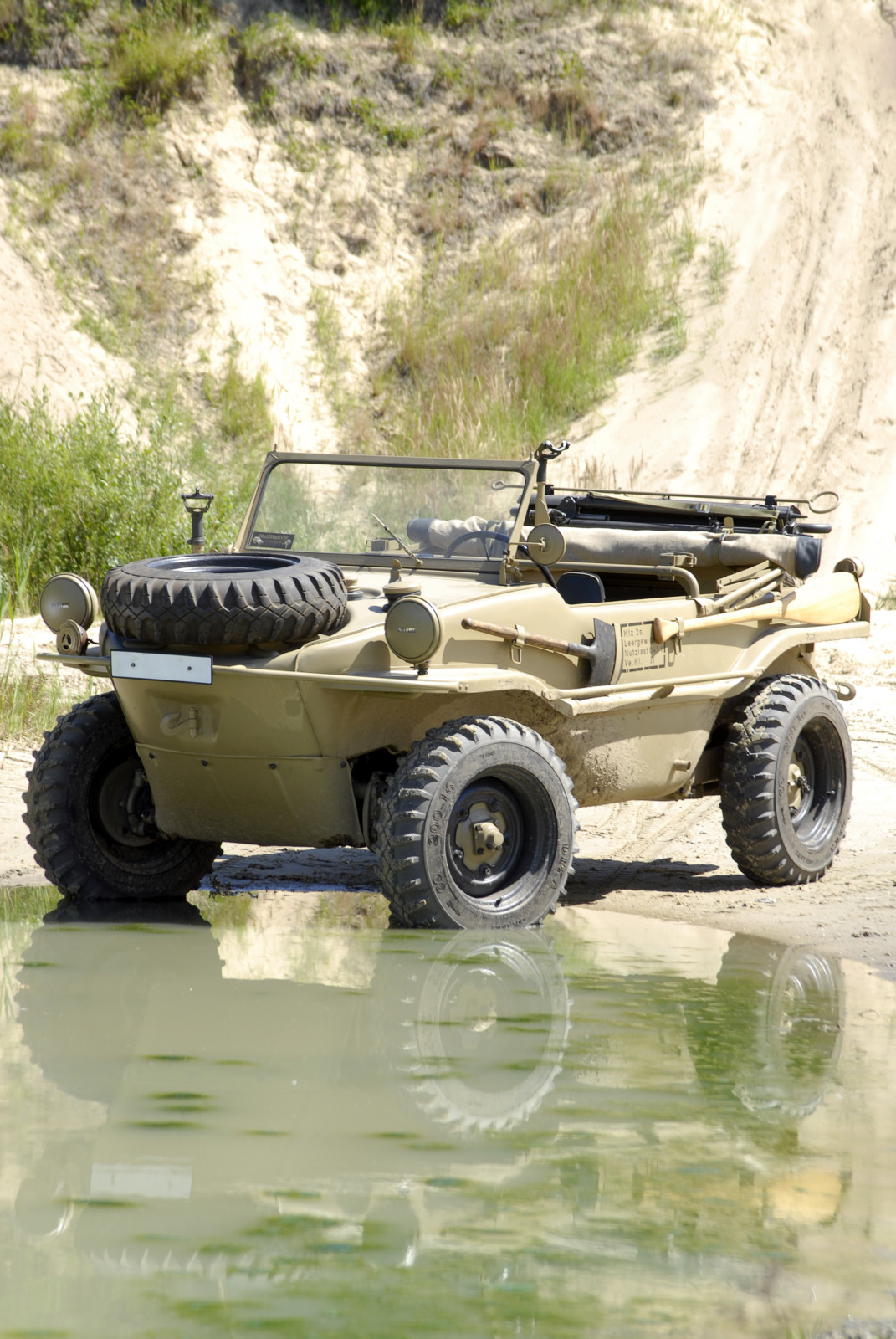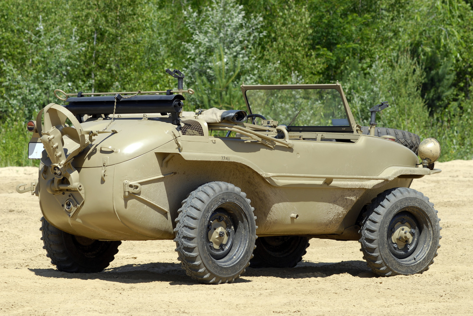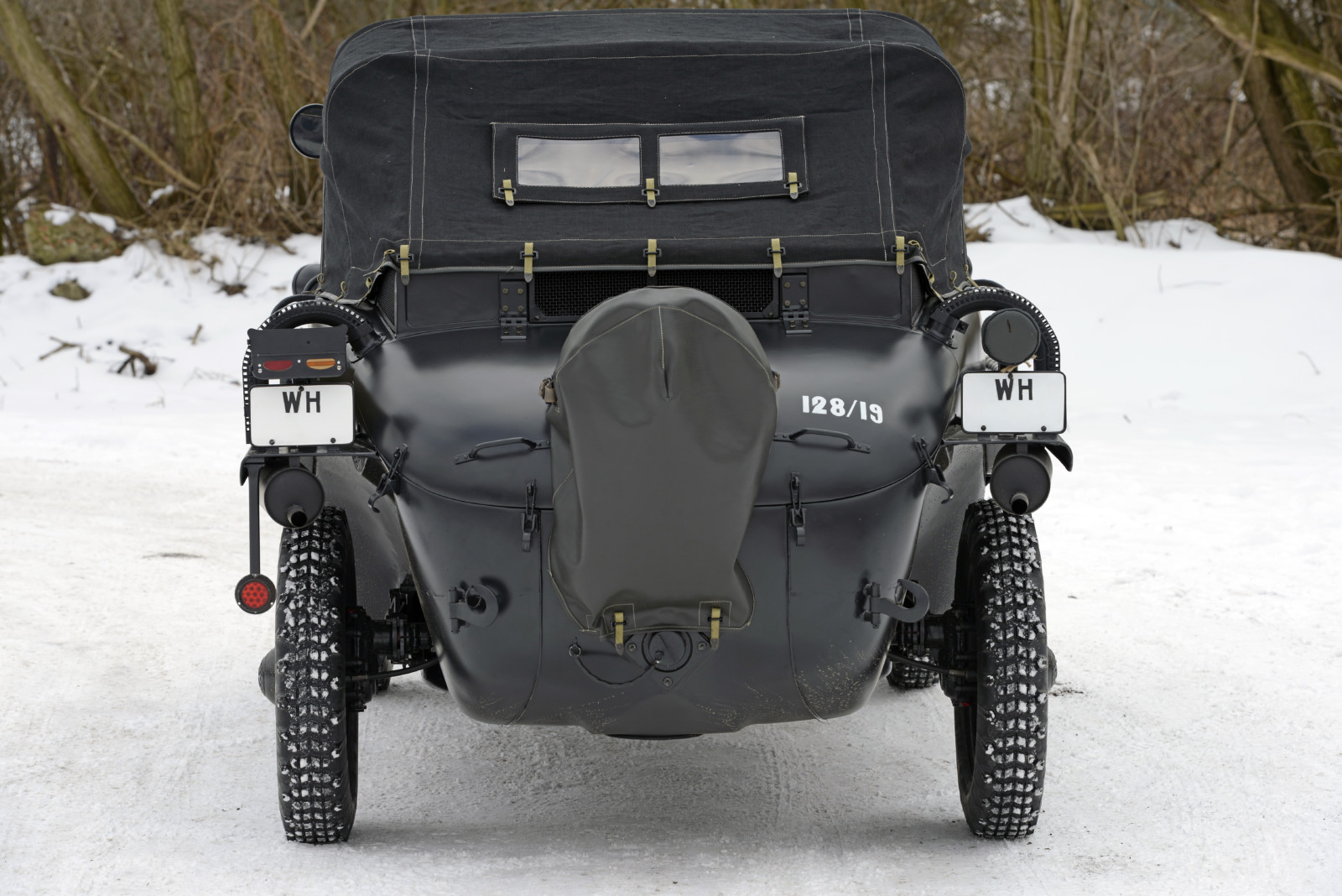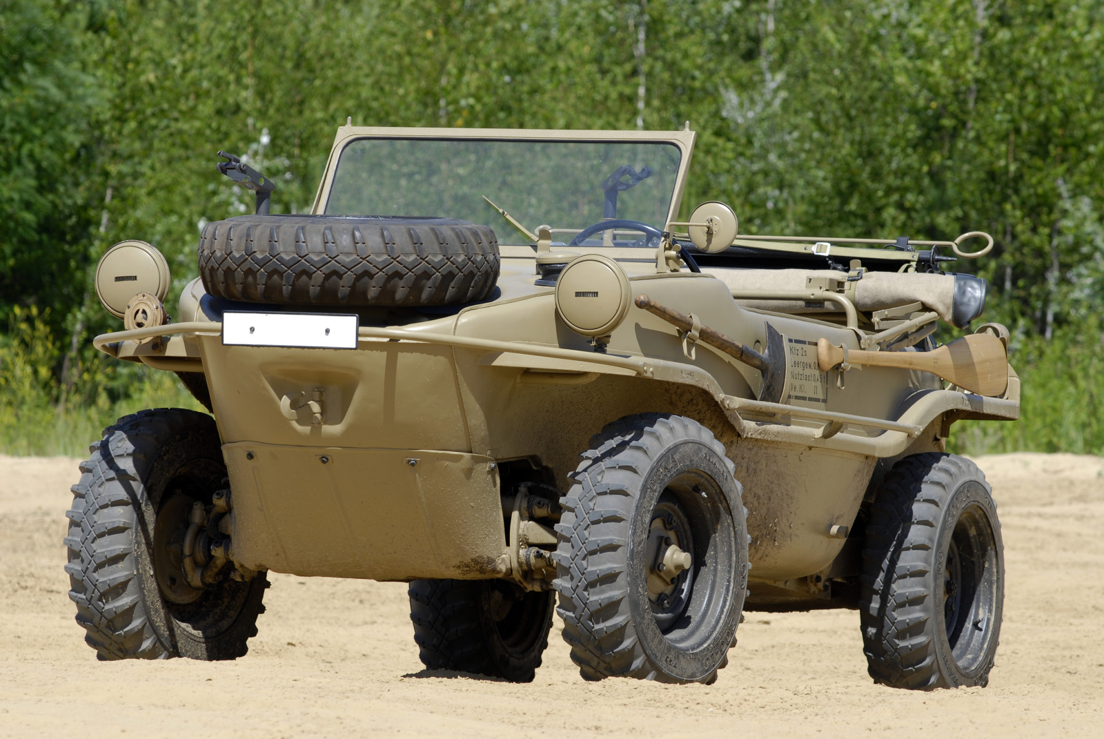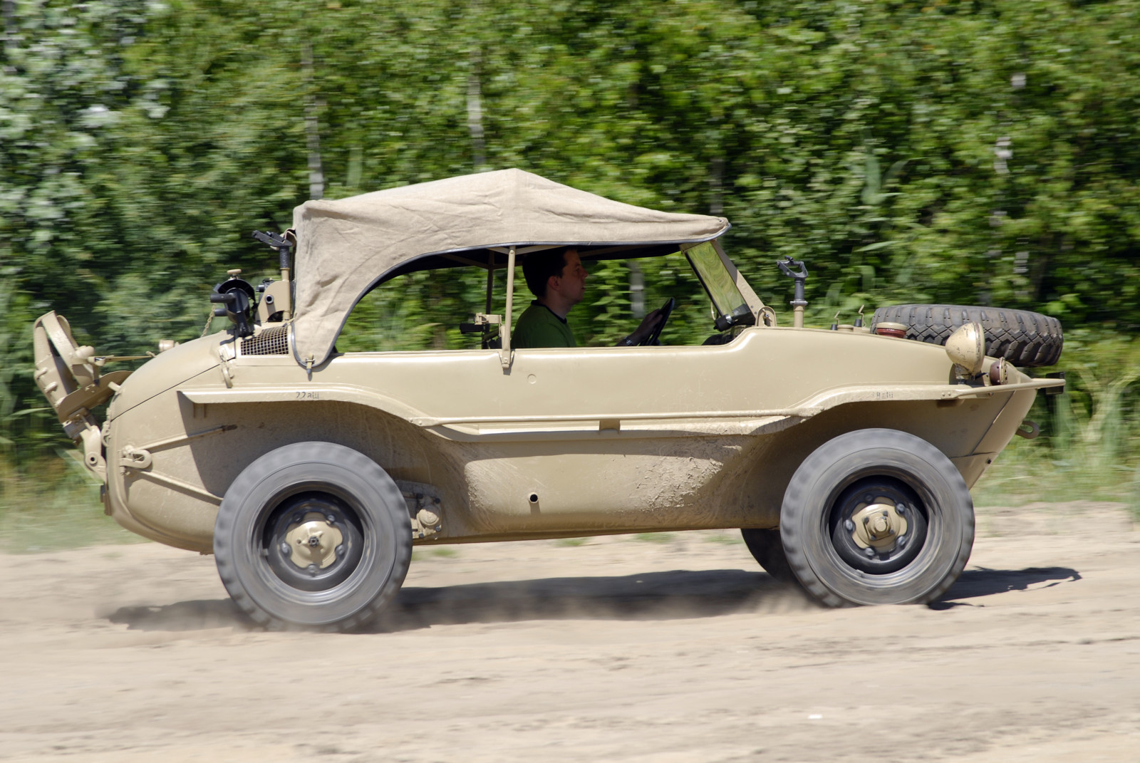 Ciemnoszare auto, które widzicie na zdjęciach, ma numer 19, pochodzi z pierwszej partii 30 prototypów Typ 128 z roku 1940. Druga widoczna na zdjęciach amfibia koloru piaskowego to Typ 166 po restauracji. Aut Typu 166 wyprodukowano podczas wojny ponad 14 tysięcy.