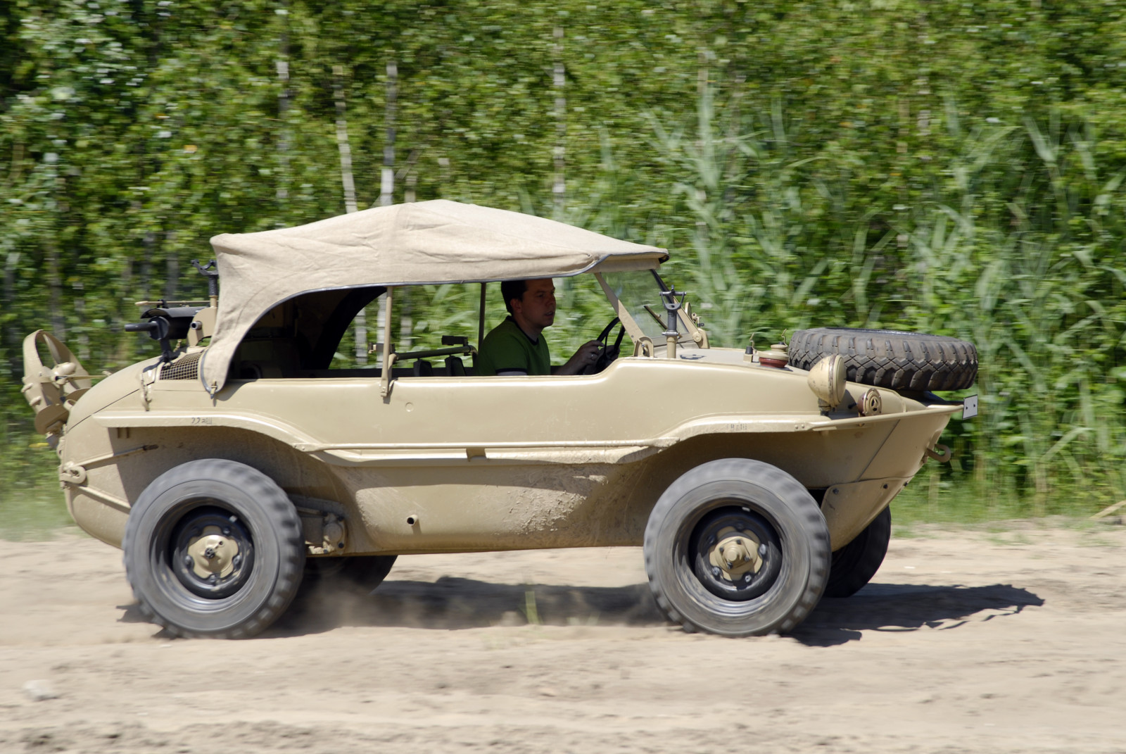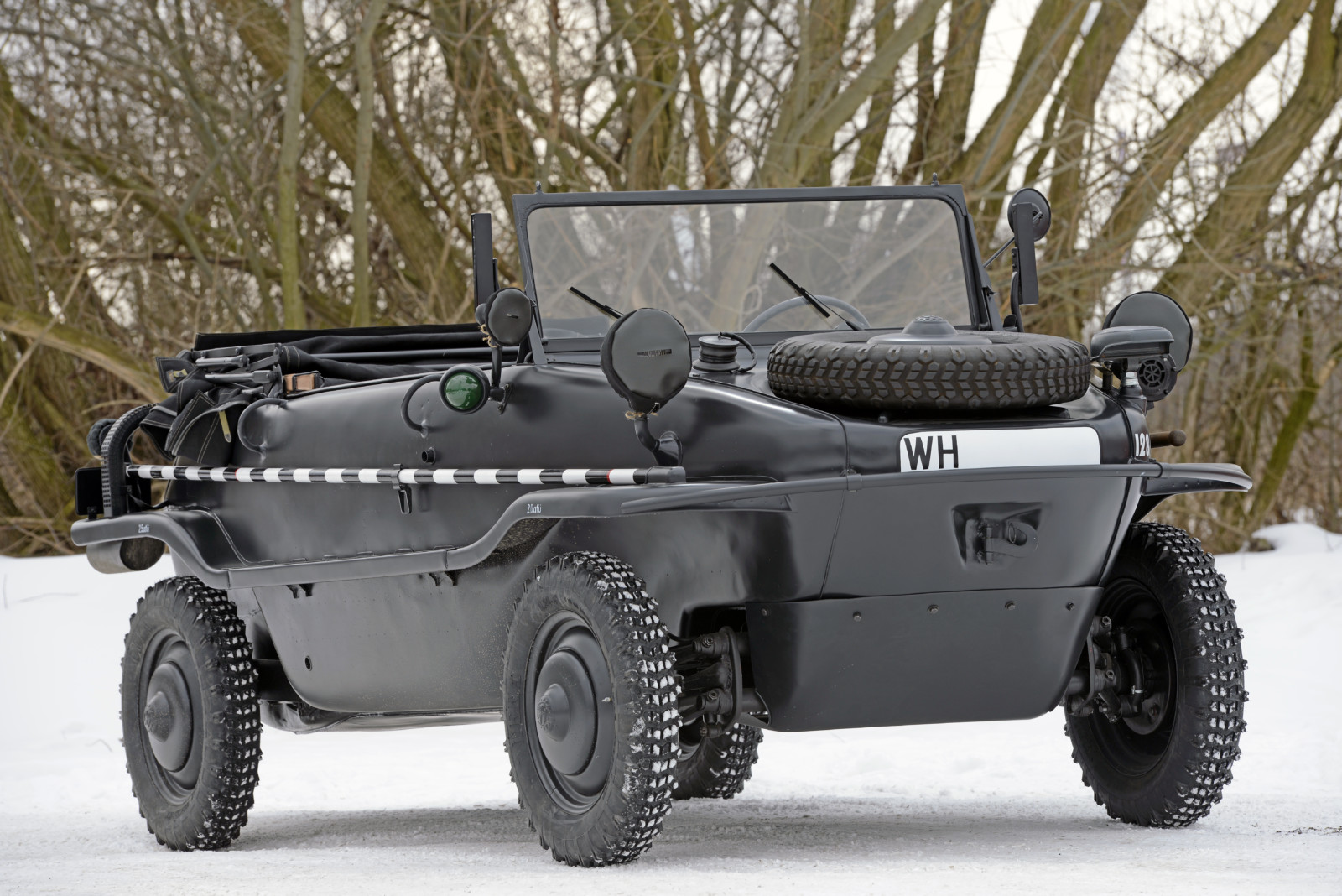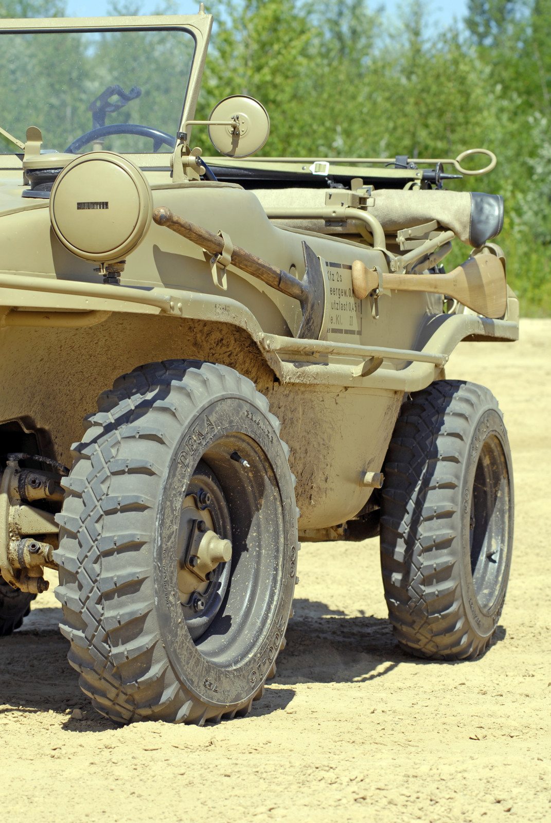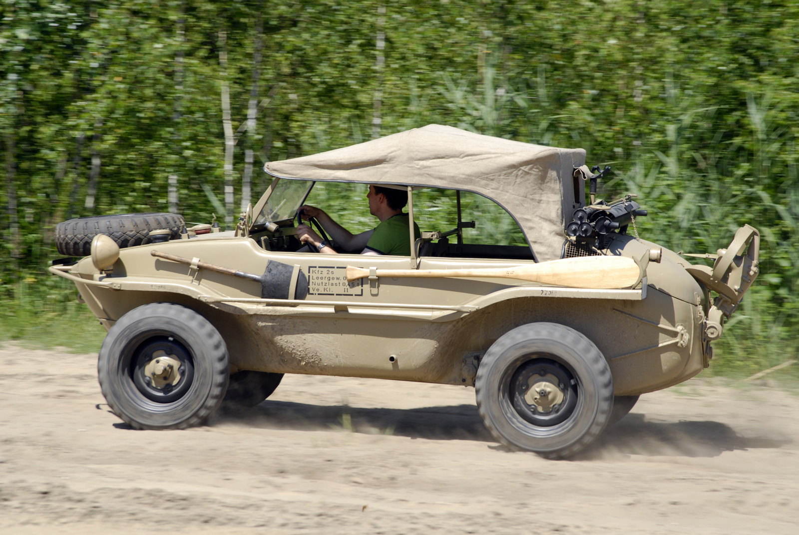 Ciemnoszare auto, które widzicie na zdjęciach, ma numer 19, pochodzi z pierwszej partii 30 prototypów Typ 128 z roku 1940. Druga widoczna na zdjęciach amfibia koloru piaskowego to Typ 166 po restauracji. Aut Typu 166 wyprodukowano podczas wojny ponad 14 tysięcy.