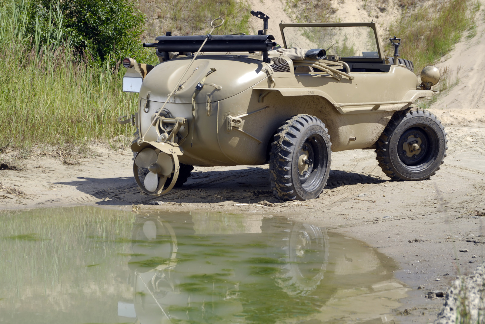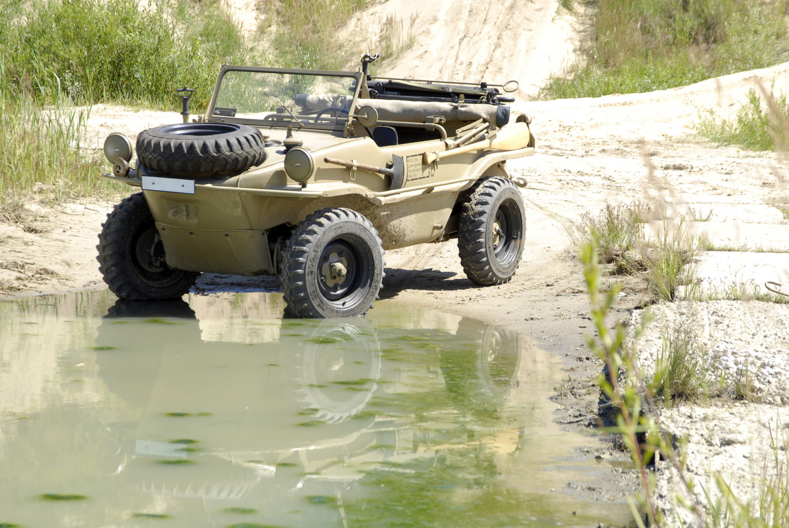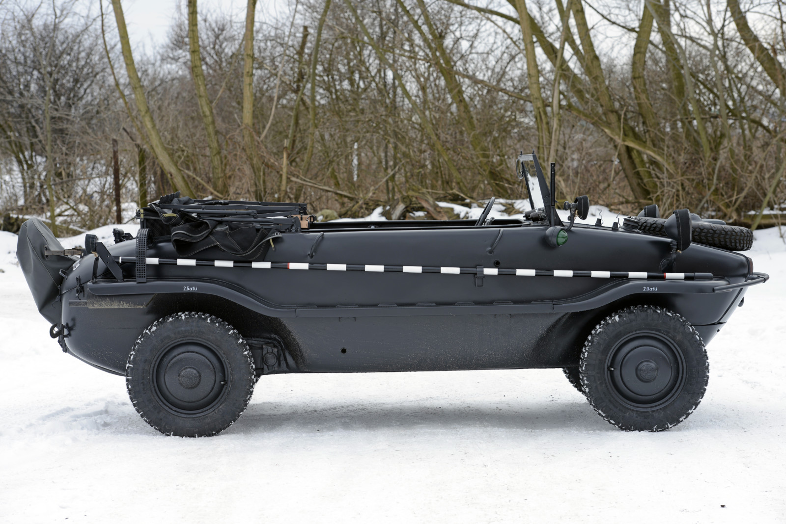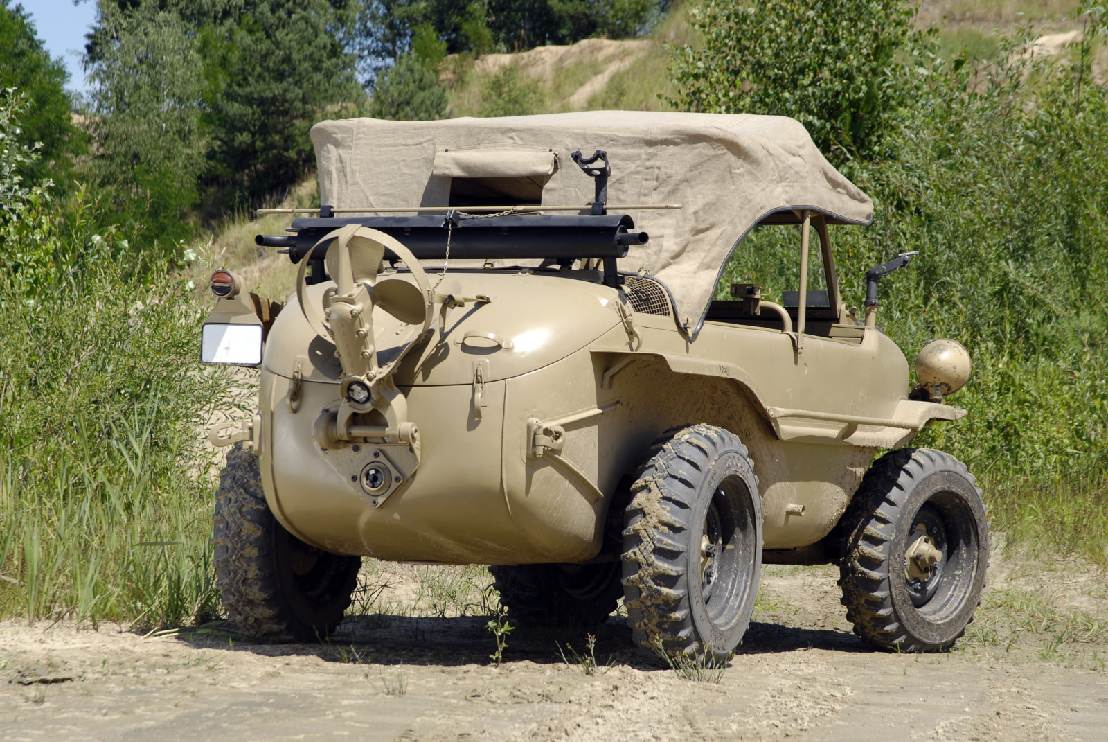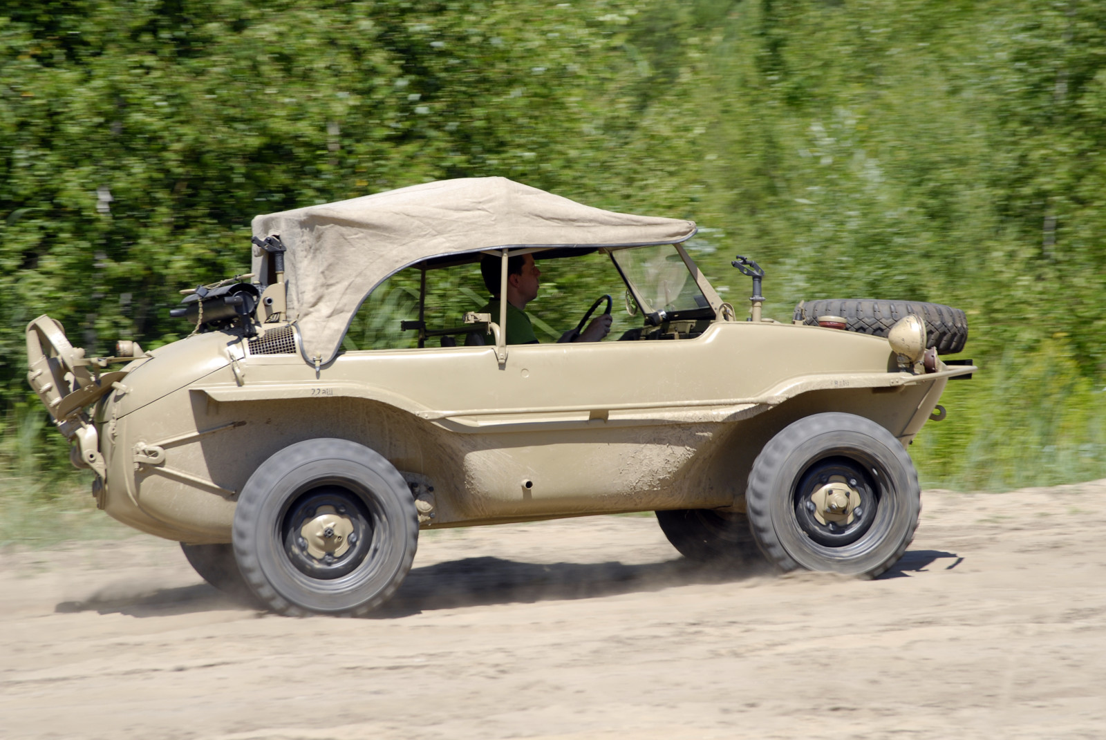 Ciemnoszare auto, które widzicie na zdjęciach, ma numer 19, pochodzi z pierwszej partii 30 prototypów Typ 128 z roku 1940. Druga widoczna na zdjęciach amfibia koloru piaskowego to Typ 166 po restauracji. Aut Typu 166 wyprodukowano podczas wojny ponad 14 tysięcy.