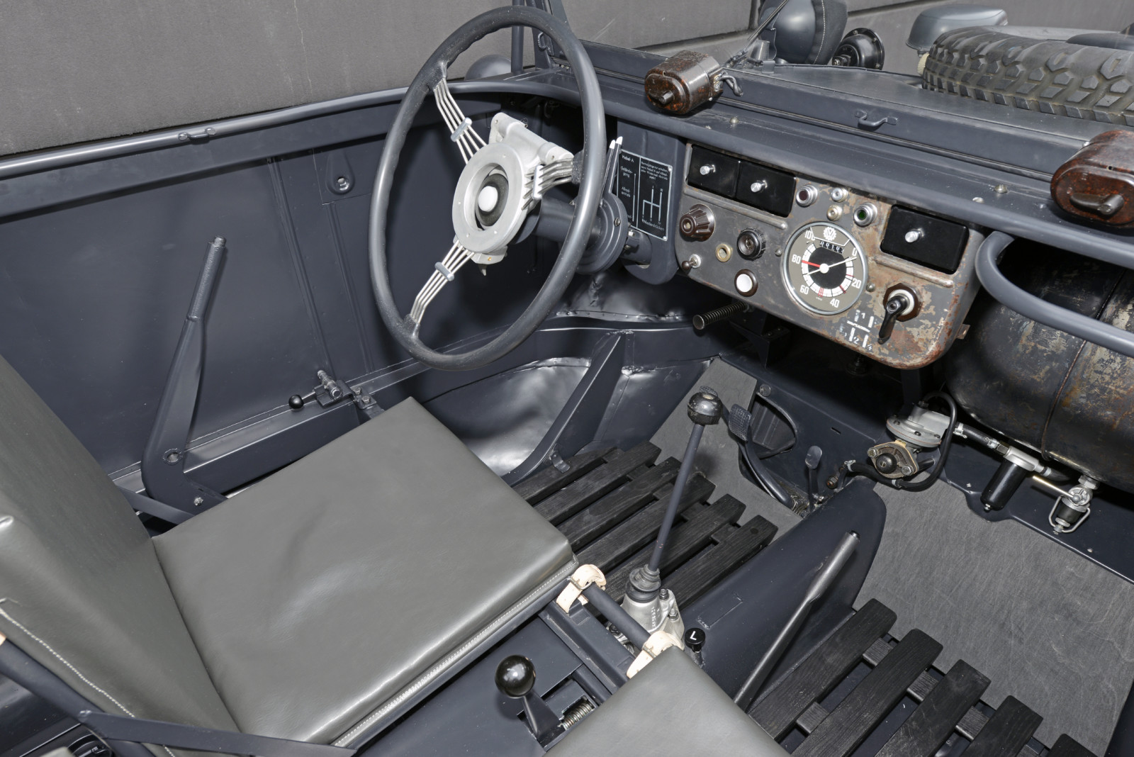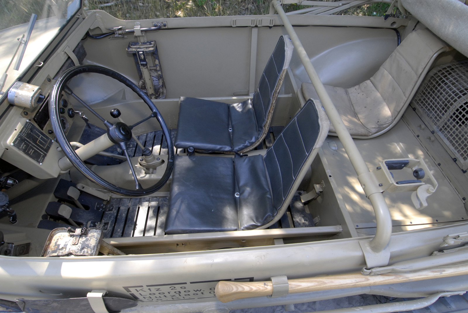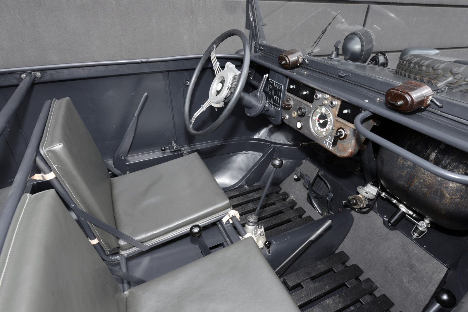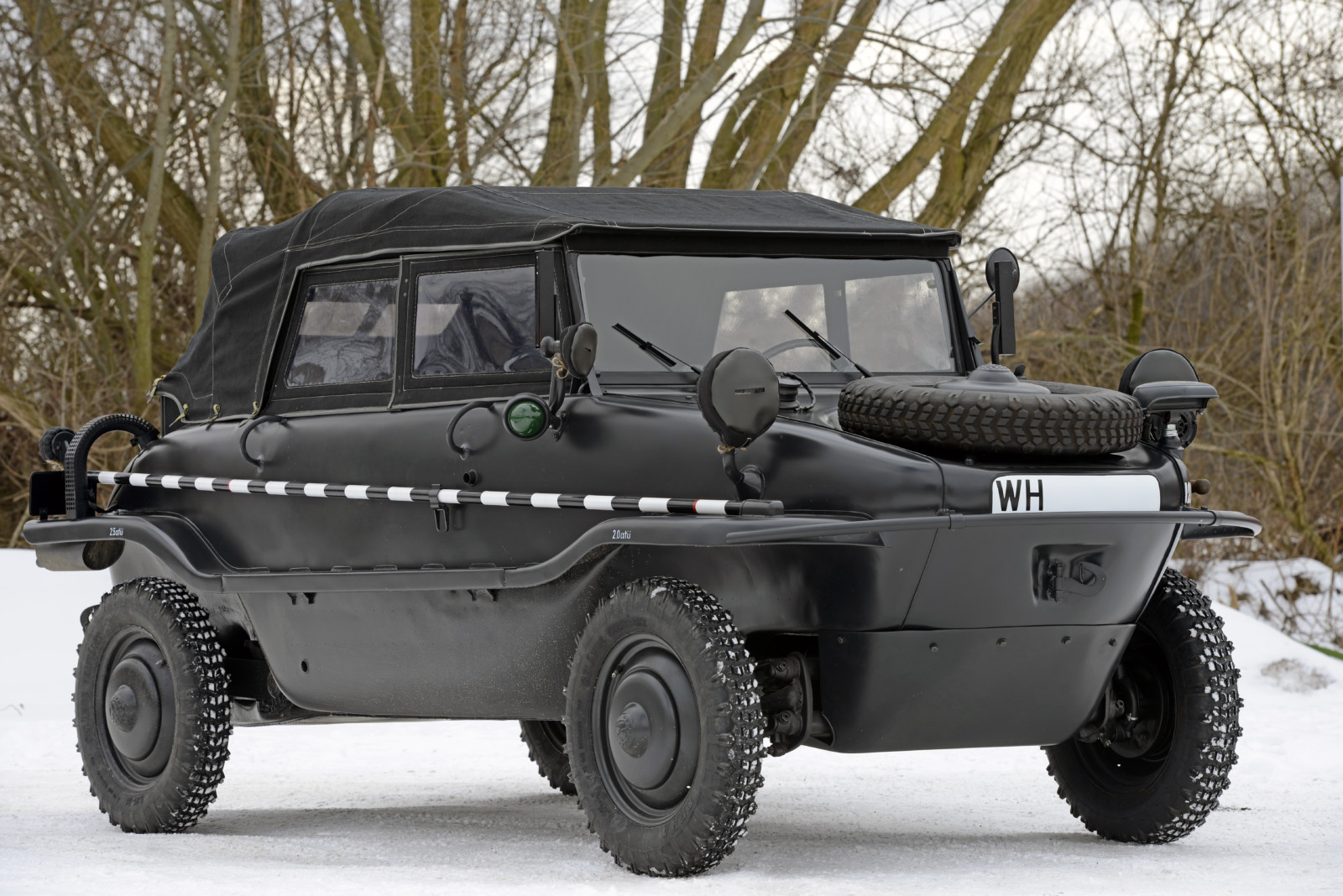 Ciemnoszare auto, które widzicie na zdjęciach, ma numer 19, pochodzi z pierwszej partii 30 prototypów Typ 128 z roku 1940. Druga widoczna na zdjęciach amfibia koloru piaskowego to Typ 166 po restauracji. Aut Typu 166 wyprodukowano podczas wojny ponad 14 tysięcy.
