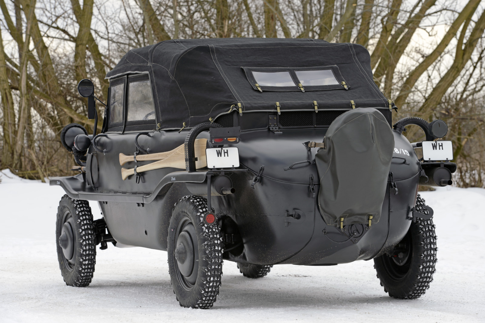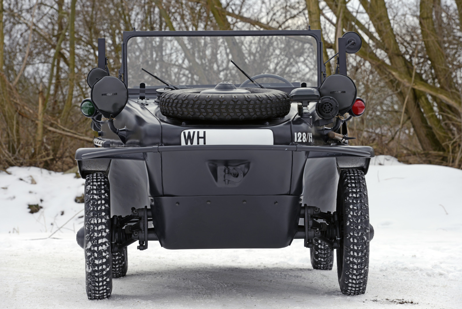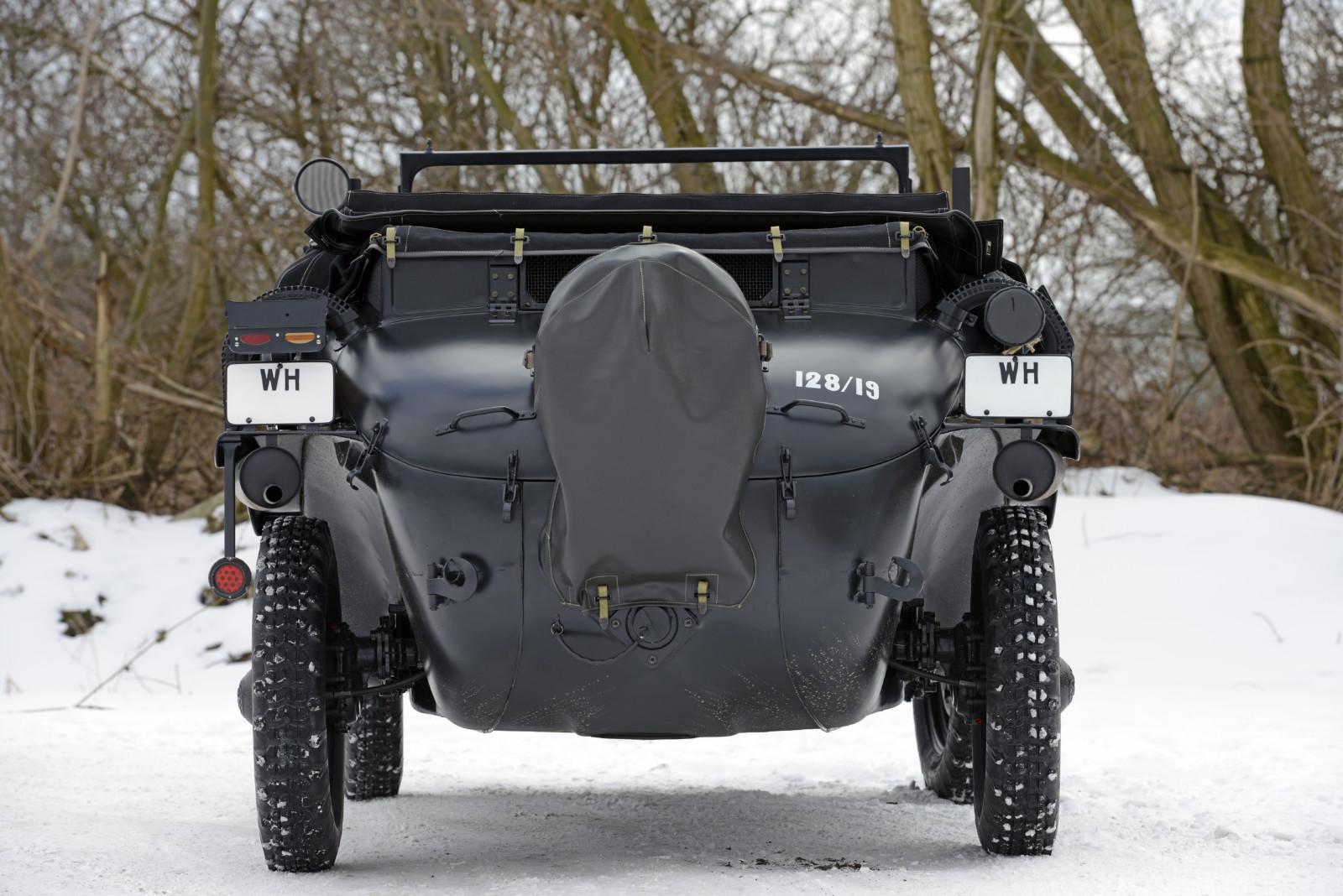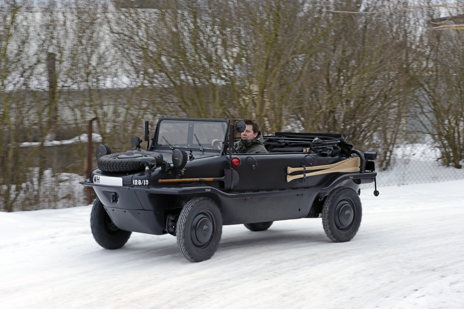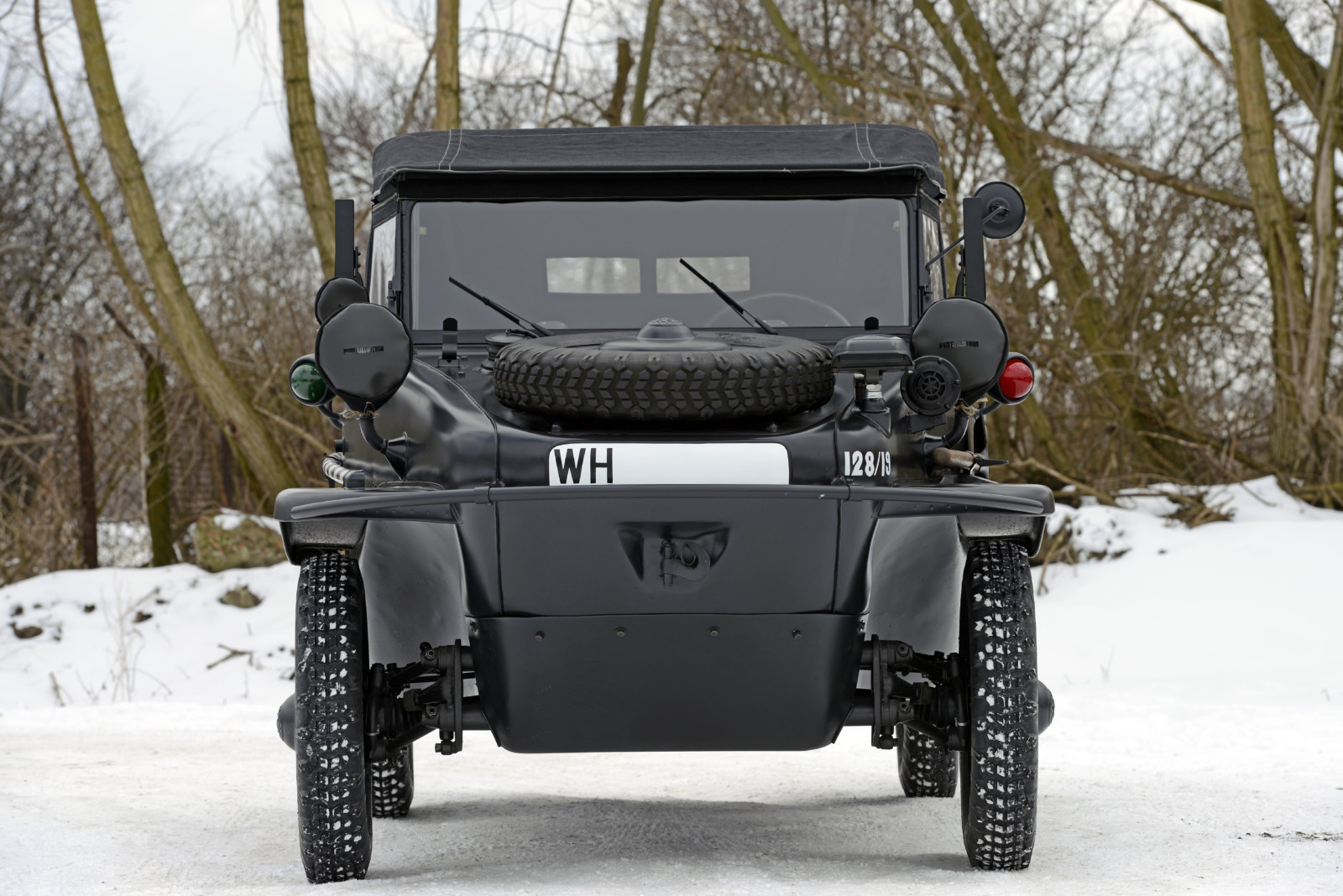 Auto o numerze 128/19 w kolorze Feld Grau jest w tym momencie najstarszym znanym Schwimmwagenem na świecie.