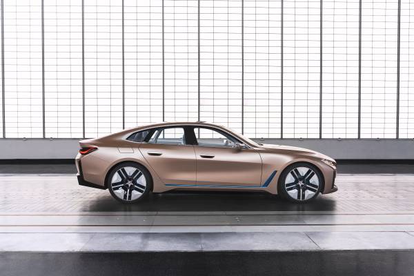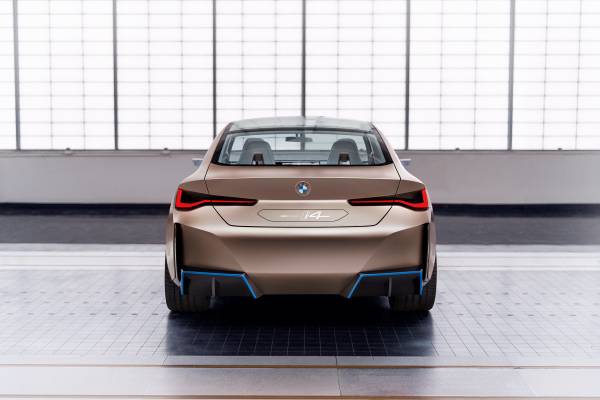 Aby ograniczyć hałas towarzyszący szybszej jeździe, BMW dopracowało nadwozie i4 od strony aerodynamiki. Nieco zaskakującym elementem jest potężny dyfuzor, który przypomina wyczynowe auta. Styliści wnętrza postawili na minimalizm. Najważniejszym elementem kokpitu są wyświetlacze pokryte taflą antyrefleksyjnego szkła oraz pokrętło systemu iDrive, którym zarządza się większością funkcji pojazdu. Wspomniany kontroler został wykonany z kryształu. Wątpliwe jednak, by trafił on do seryjnie produkowanego i4, podobnie jak dwa indywidualne fotele zamiast tylnej kanapy.