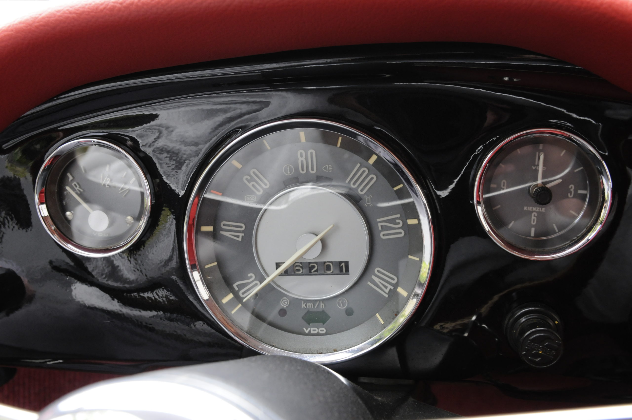 Wnętrze: skórzana czerwona tapicerka, dywaniki wykonane z oryginalnego materiału boucle, drewniana kierownica Nardi, lewarek zmiany biegów Empi o skróconym skoku.