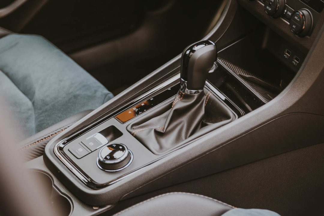 Po zajęciu miejsca w środku zostaniemy otuleni bardzo wygodnymi kubełkowymi fotelami z tapicerką w kolorze Petrol Blue. Ten sam materiał znajduje się również na boczkach drzwiowych. Deska rozdzielcza zawiera karbonowe elementy dekoracyjne i pakiet BLACK (elementy konsoli centralnej i klamki kolorze lśniącej czerni). Pozycja za kierownicą przypomina mostek kapitański – SUV ma wspaniałą widoczność i jest przestronny. Dotyczy to również tylnej kanapy, gdzie spokojnie zmieszczą się trzy dorosłe osoby – to pełnoprawne auto rodzinne. Przedział bagażowy jest foremny i w testowym egzemplarzu był wyposażony w gniazda 12V i 220V. Jazdę uprzyjemnia nagłośnienie BeatsAudioTM sterowane z 8-calowego systemu multimedialnego. Jest to dość leciwy interfejs, ale można połączyć go z telefonem za pomocą standardu CarPlay. Dużo lepsze wrażenie robi cyfrowy kokpit przed kierowcą- wśród rozmaitych trybów graficznych jest jeden z centralnie umieszczonym obrotomierzem. Jest on podobny do tego, co oferuje Audi w najmocniejszych wersjach swoich Audi – RS.