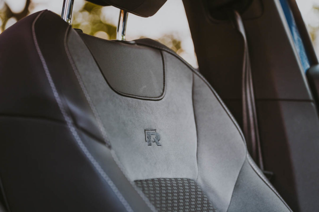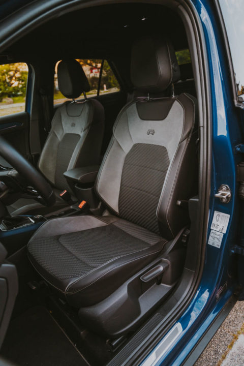 T-Roc jest podobny do większego o rozmiar Tiguana. Prezentowana wersja R to obecnie najbardziej sportowy SUV w ofercie VW. Miałem już kilka razy okazję jeździć „cywilnym” T-Rociem i uważam go za udaną konstrukcję, ale niepozbawioną wad. Z przodu w Rce jest bardzo wygodnie, ale ilość miejsca oferowanego z tyłu nie pozwala mi myśleć o nim, jako o samochodzie rodzinnym. Deska rozdzielcza w tej wersji ma niebieskie dekory, a logo R pojawia się na fotelach, progach oraz kierownicy. Wnętrze jest ergonomiczne i przyjemnie. Trzeba jedynie uważać na plastiki, ponieważ są twarde i można je zarysować. Inaczej niż w CUPRZE, która ma „miękką” deskę rozdzielczą. Bardzo przyjemne w dotyku są natomiast fotele, które w tej odmianie są odpowiednio wyprofilowane i mają podniesione do góry oparcia po obu stronach zagłówków. Do tego czarna podsufitka, aluminiowe nakładki na pedały i obszyte skórą miejsca, które dotykane są najczęściej. Wszystkie te dodatki świetnie dopełniają najmocniejszą 300-konną wersję 2.0 TSI z automatem DSG i napędem 4Motion. Bagażnik ma pojemność 445 l do wysokości szyb, ale ścięty tył skutecznie ją ogranicza do wysokości dachu.