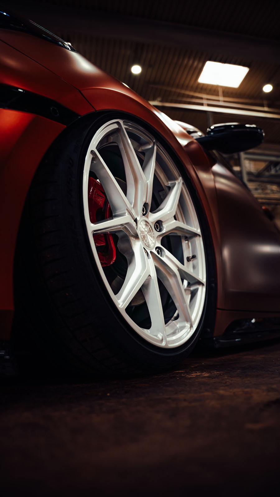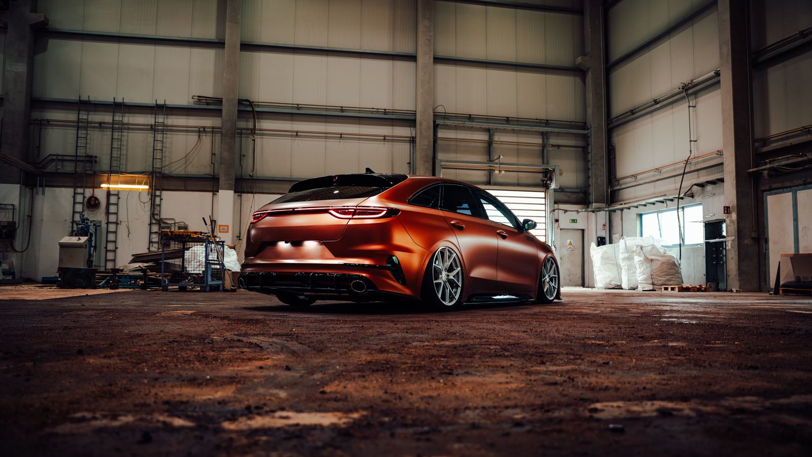 Zestaw pneumatyczny Grinds pozwala ProCeedowi imponująco nisko opaść za naciśnięciem jednego przycisku. Po pełnym obniżeniu, zaledwie kilka centymetrów dzieli jezdnię od spojlerów z czarnego zestawu nadwozia Maxton Design. Miedziana folia idealnie dopełnia stylizację.