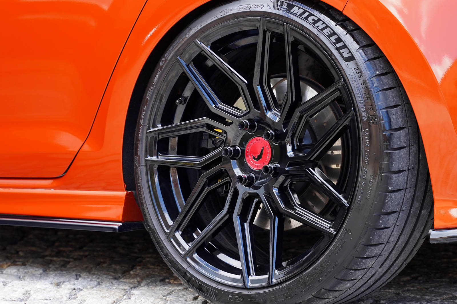 Pomimo różnej szerokości, opony mają jednolity rozmiar 235/35R19. Wykończenie w kolorze Higloss Black, a odpowiednie obniżenie wynika z zastosowania zawieszenia gwintowanego KW Variant 3.